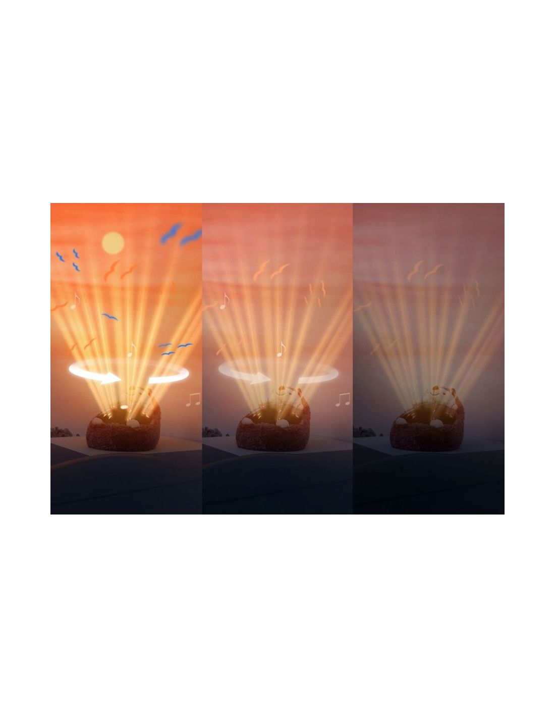 KROK 1 - Wyciszenie: W ciągu pierwszych 10 minut, poruszająca się animacja zachodzącego słońca, fruwające ptaki i kojące dźwięki z afrykańskiego pleneru przygotowują malucha do snu.