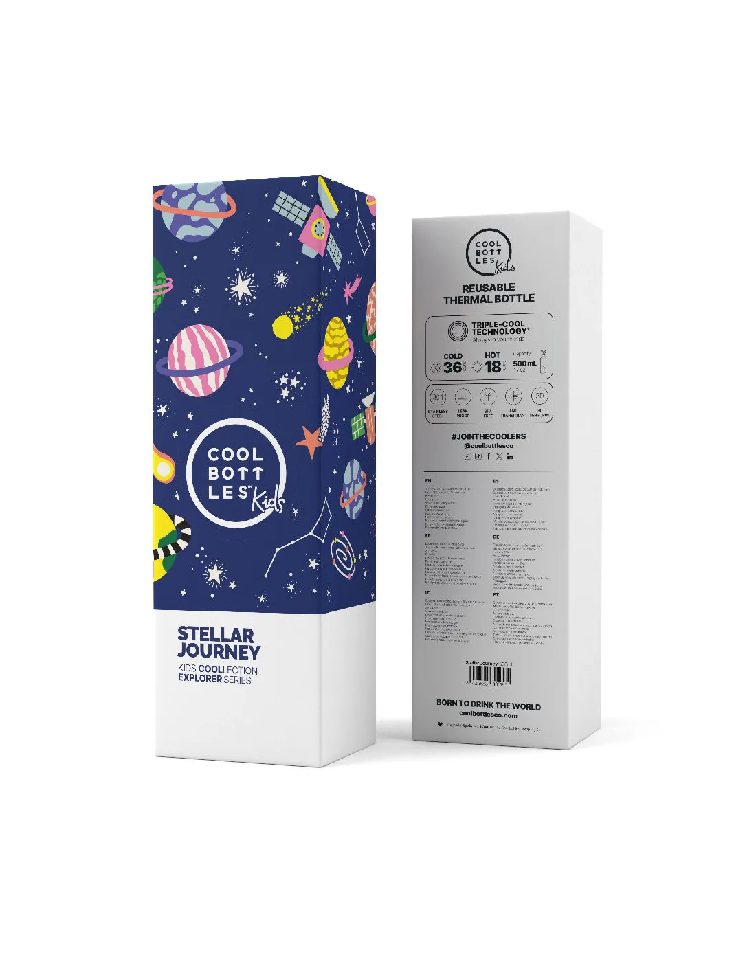 Kolekcja Cool Bottles™ Kids oferuje wzory pełne przyjaznych motywów, zwierząt i roślin, które rozwijają wyobraźnię i zachęcają dzieci do regularnego picia wody. Wzór Stellar Journey wyróżnia się kosmiczną energią i fantazyjnymi detalami, inspirując dzieci do odkrywania świata i marzeń o gwiazdach.