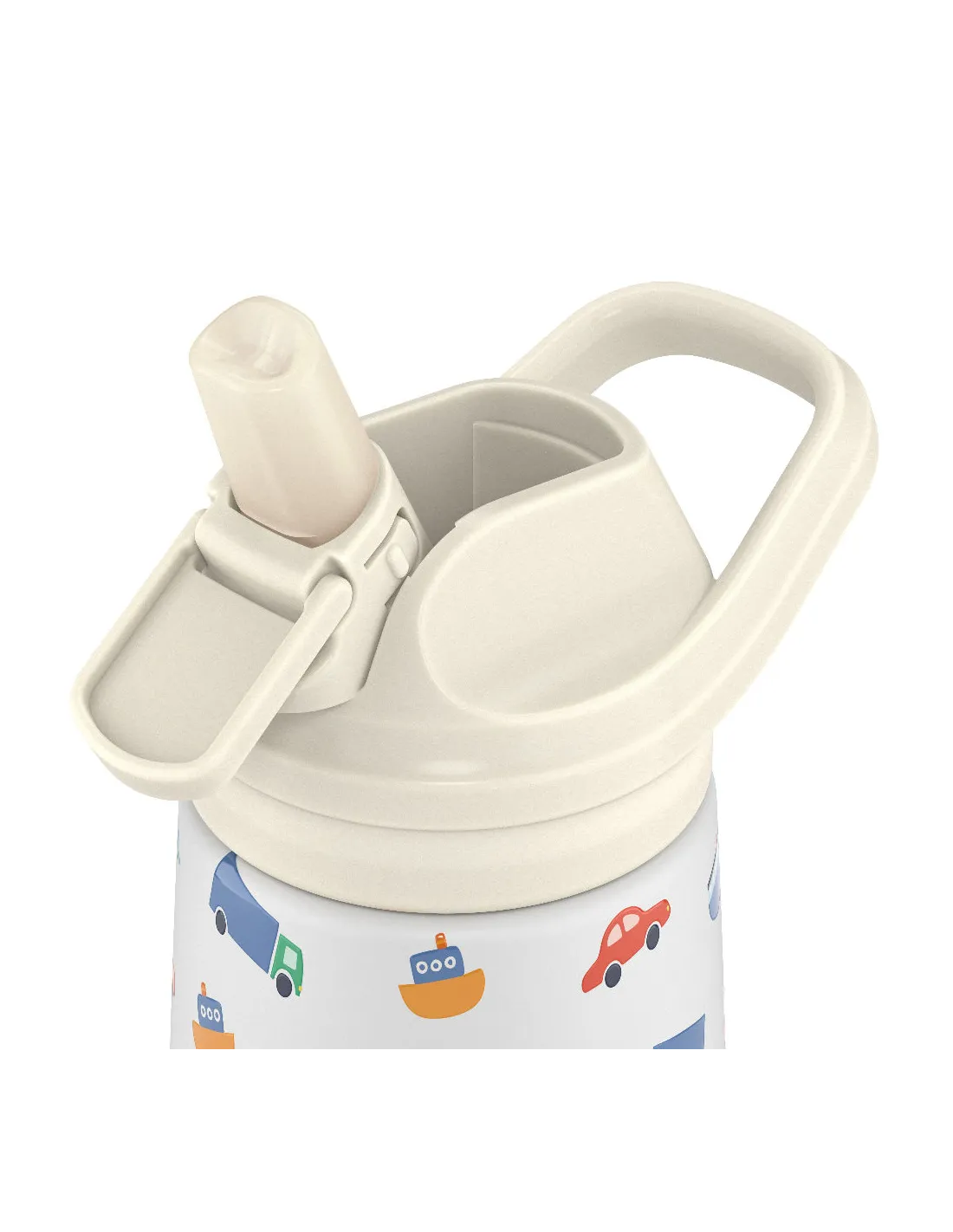 Trójwymiarowy nadruk Little Wheels z wykończeniem proszkowym jest przyjemny w dotyku i zapewnia dodatkowe wrażenia sensoryczne. Zintegrowany uchwyt ułatwia przenoszenie, a szeroki otwór umożliwia wygodne dodawanie kostek lodu.