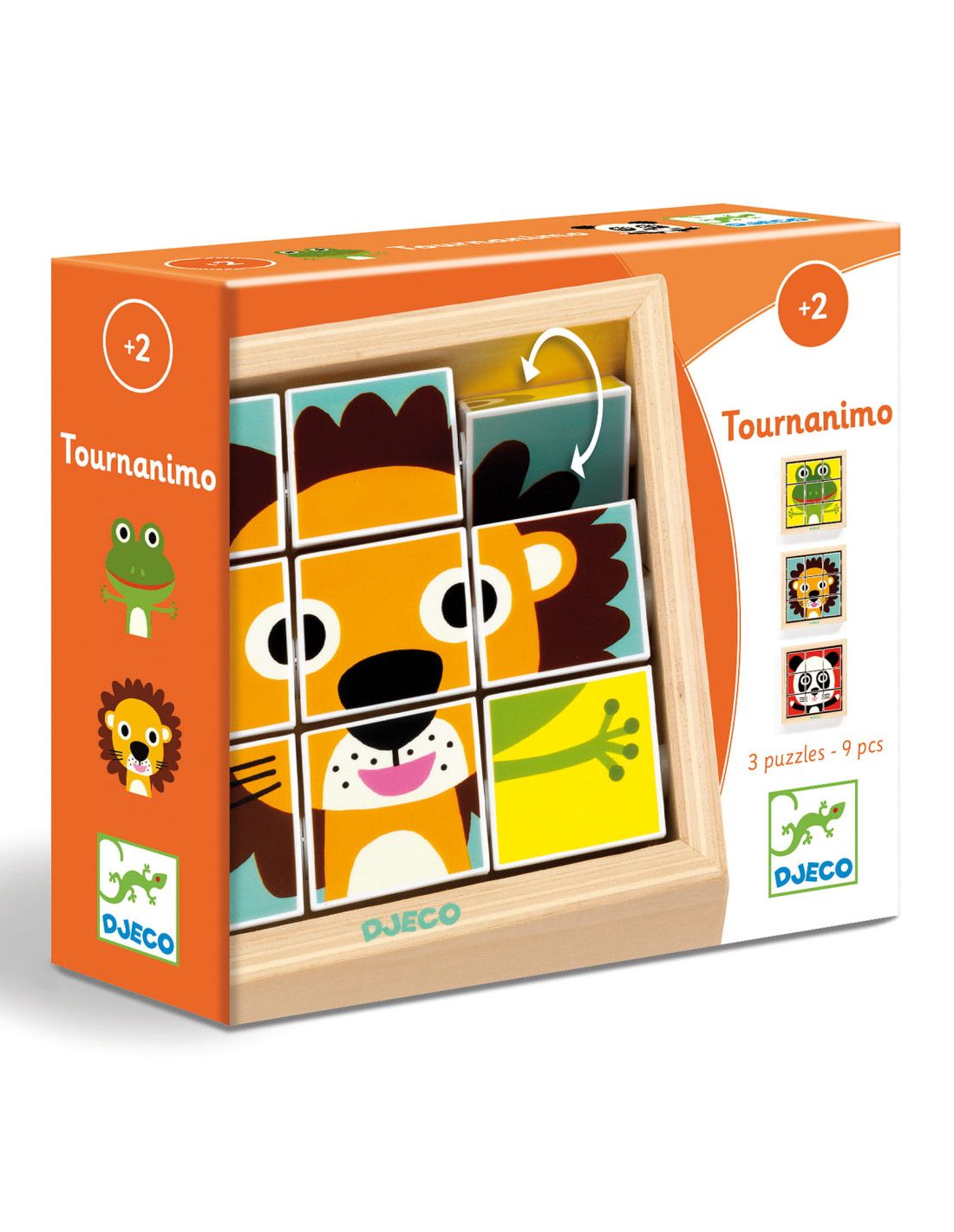 Drewniane klocki - "puzzle" składające się z 9 elementów, na których są różne części układanki. Klocki znajdują się w drewnianym pudełku i są na stałe przytwierdzone - obrazki układa się obracając elementy wewnątrz pudełka.