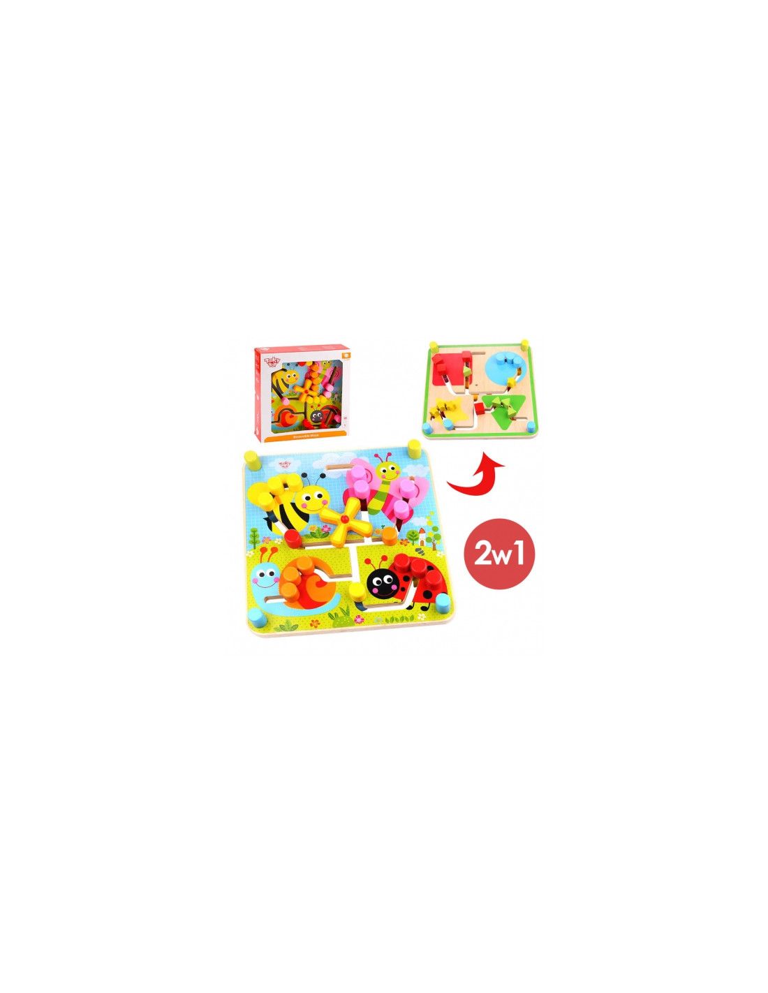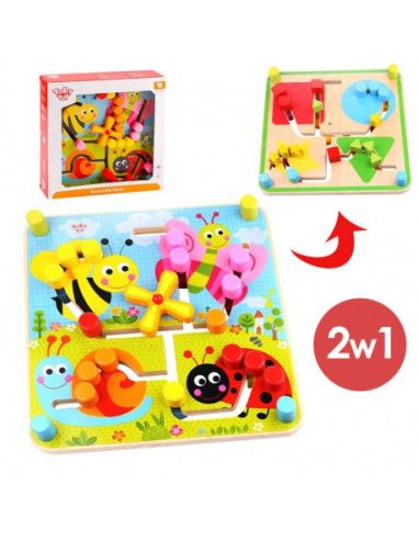 Tooky Toy Labirynt- to zabawka gdzie po pierwszej stronie planszy odnajdziemy cztery różnokolorowe kształty geometryczne. Po drugiej ze stron możemy znaleźć kolorowe owady i zwierzątka. Zabawka wspomaga rozwój koordynacji ruchowej oraz zdolności motorycznych. Zapewni dziecku fantastycznych wrażeń. Zestaw może być używany przez większą liczbę urwisów. W zabawce występują również ruchome elementy. Na planszy możemy odnaleźć żółtą pszczółkę, różowego motylka, czerwoną biedronkę oraz niebieskiego ślimaka z pomarańczową skorupą, na drugiej stronie zaś zielony trójkąt, żółta gwiazdka, niebieskie kółko i czerwony kwadrat.