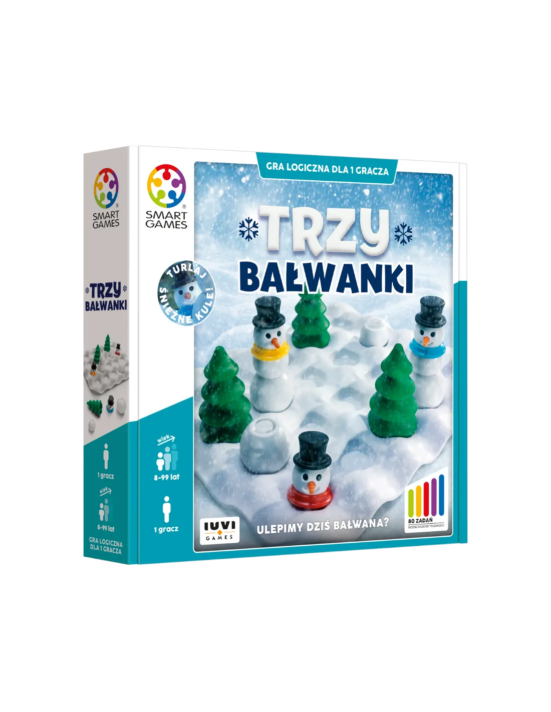 Smart Games Trzy Bałwanki PL IUVI Games to urocza, zimowa gra logiczna, która zachwyci dzieci i dorosłych lubiących przestrzenne łamigłówki. Zadaniem gracza jest przesuwanie śnieżnych kul w taki sposób, aby ułożyć jednego, dwa, a później trzy poprawnie zbudowane bałwanki.