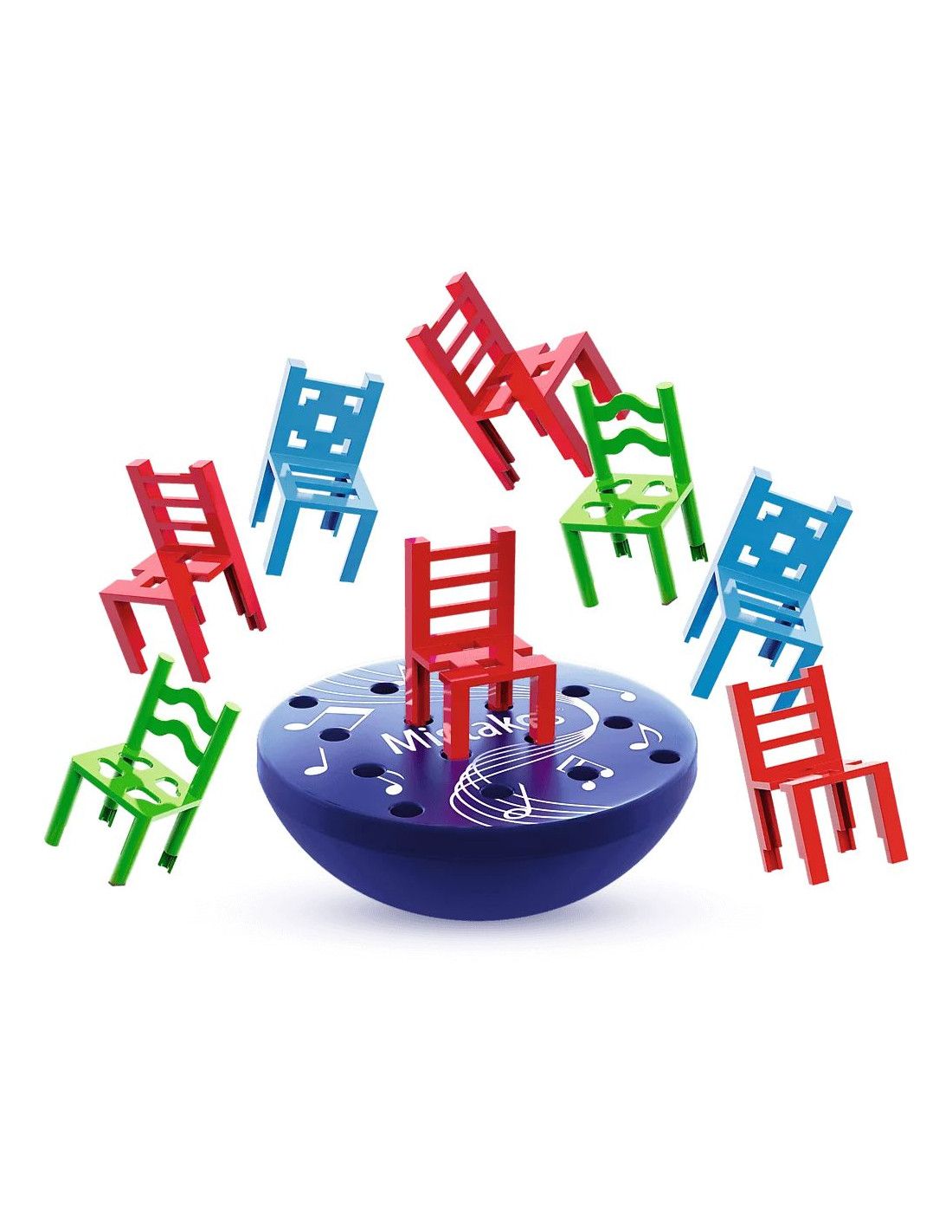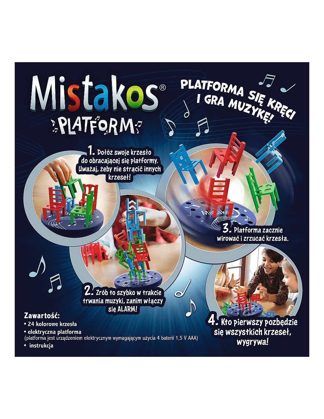 W tej dynamicznej zabawie gracze rywalizują, starając się jak najszybciej pozbyć swoich krzesełek, układając je na wirującej platformie. Jednak nie będzie to takie proste – platforma zaczyna się obracać, a krzesła mogą spadać, zwłaszcza gdy muzyka nagle się zatrzyma i włączy się alarm!