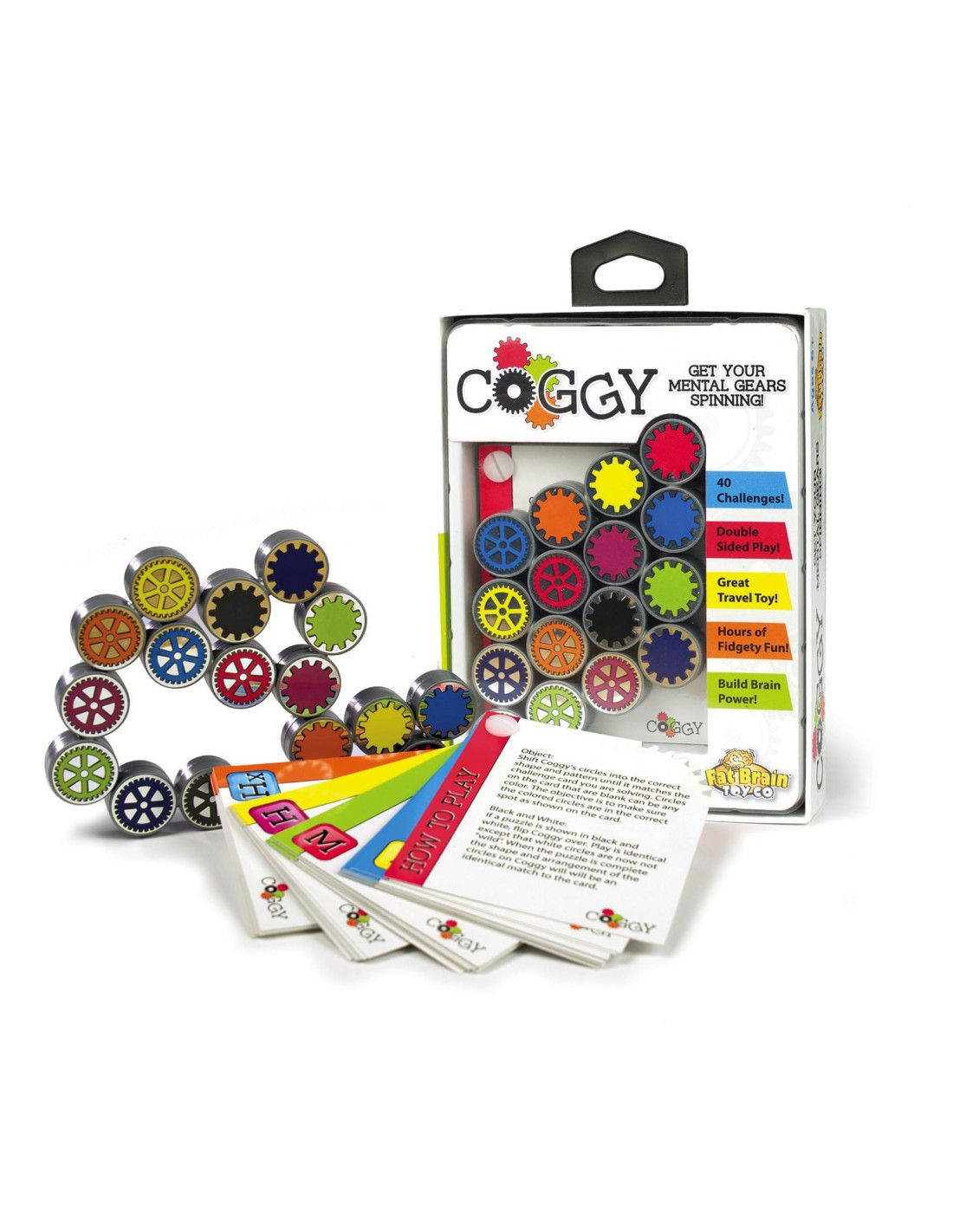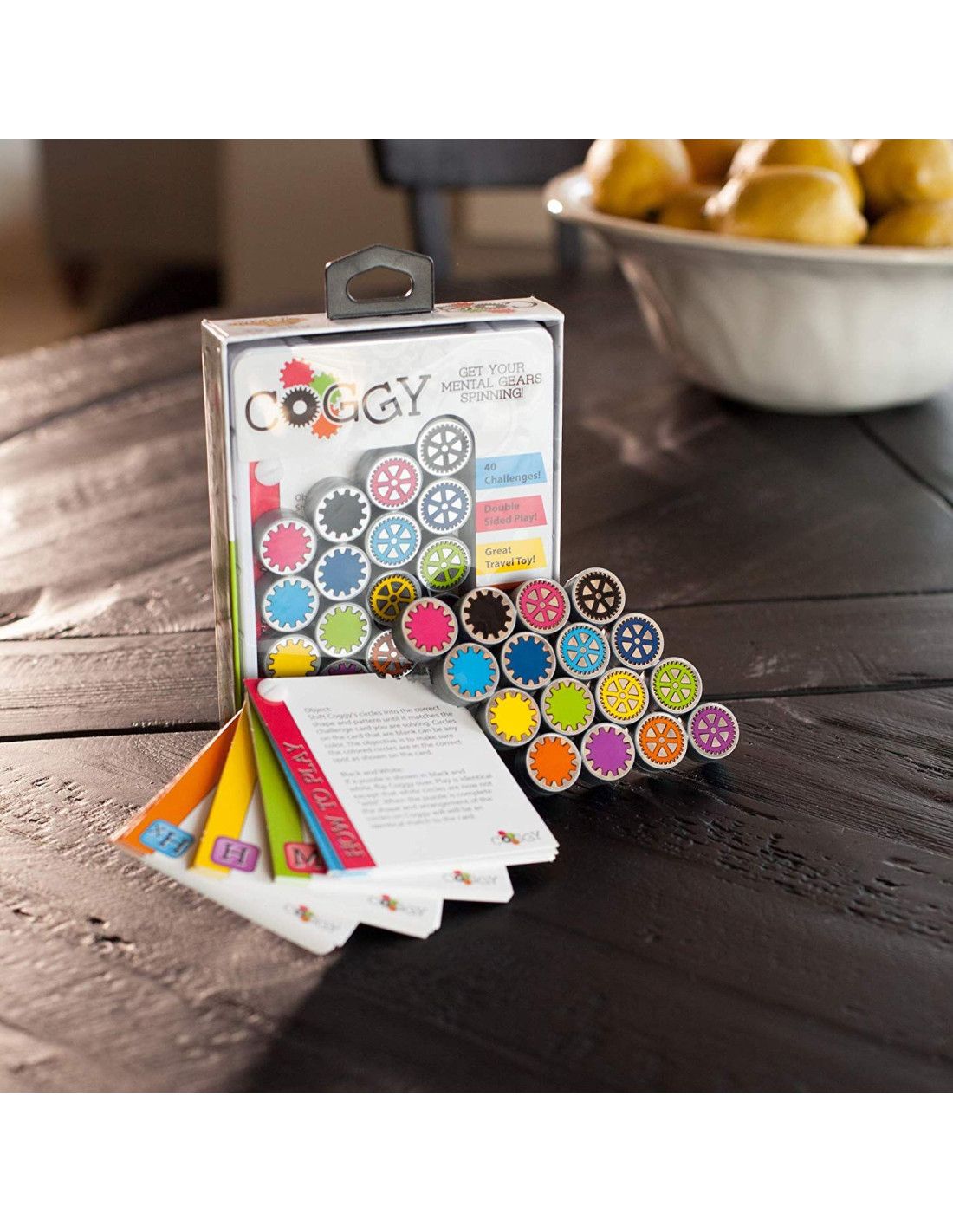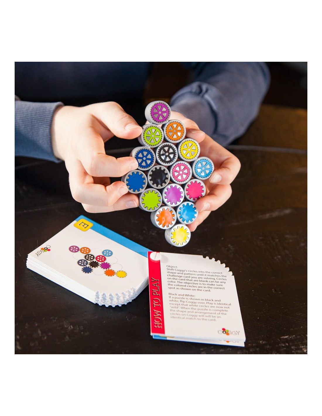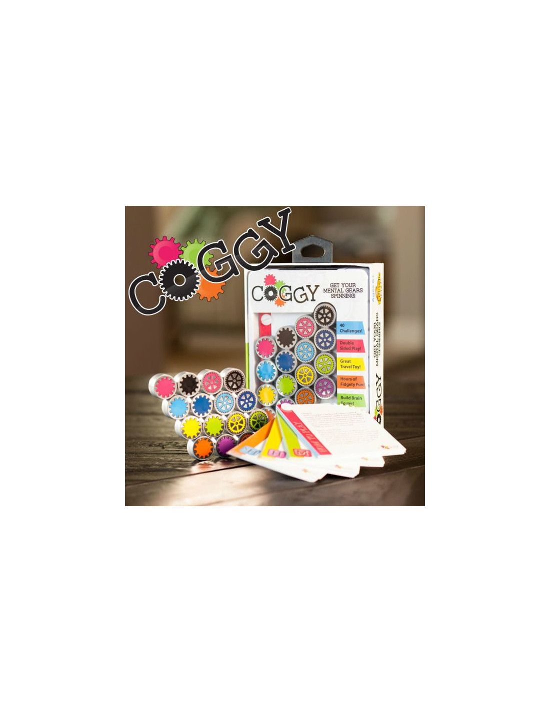 Coggy to 16 połączonych kółek zębatych, 40 wyzwań o 4 poziomach trudności (łatwe, średnie, trudne, bardzo trudne), obracaj, modeluj, układaj kolorowe kółka zębate, tak aby odtworzyć wzór na załączonych kartach. Coggy to gra, która rozwija inteligencję przestrzenno-wizualną, myślenie logiczne, zdolność krytycznego myślenia.