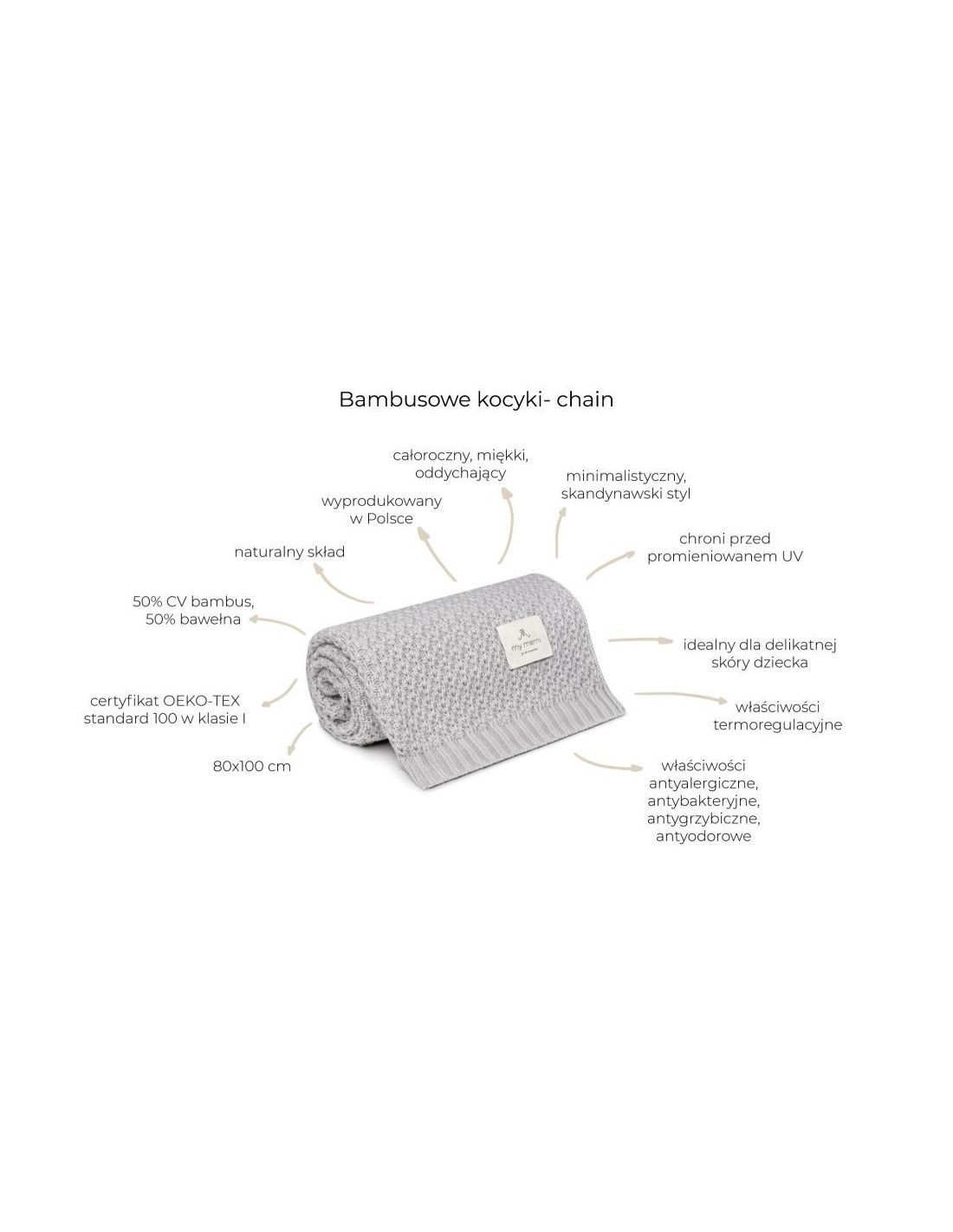 Całoroczny, miękki i oddychający kocyk w minimalistycznym, skandynawskim stylu. Dziany w całości w Polsce z certyfikowanej przędzy bambusowej z dodatkiem bawełny. Idealny dla skóry dziecka- pochłania wilgoć i utrzymuje ją z daleka od skóry, posiada właściwości termoregulacyjne- utrzymuje komfort cieplny, zapobiega przegrzewaniu.