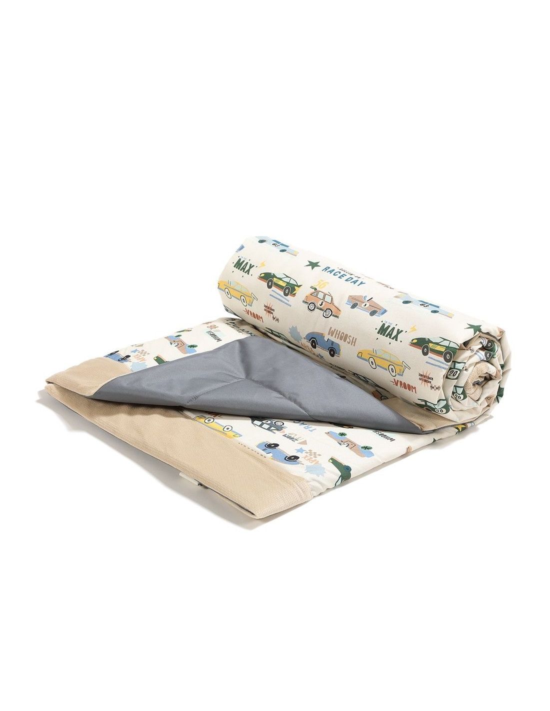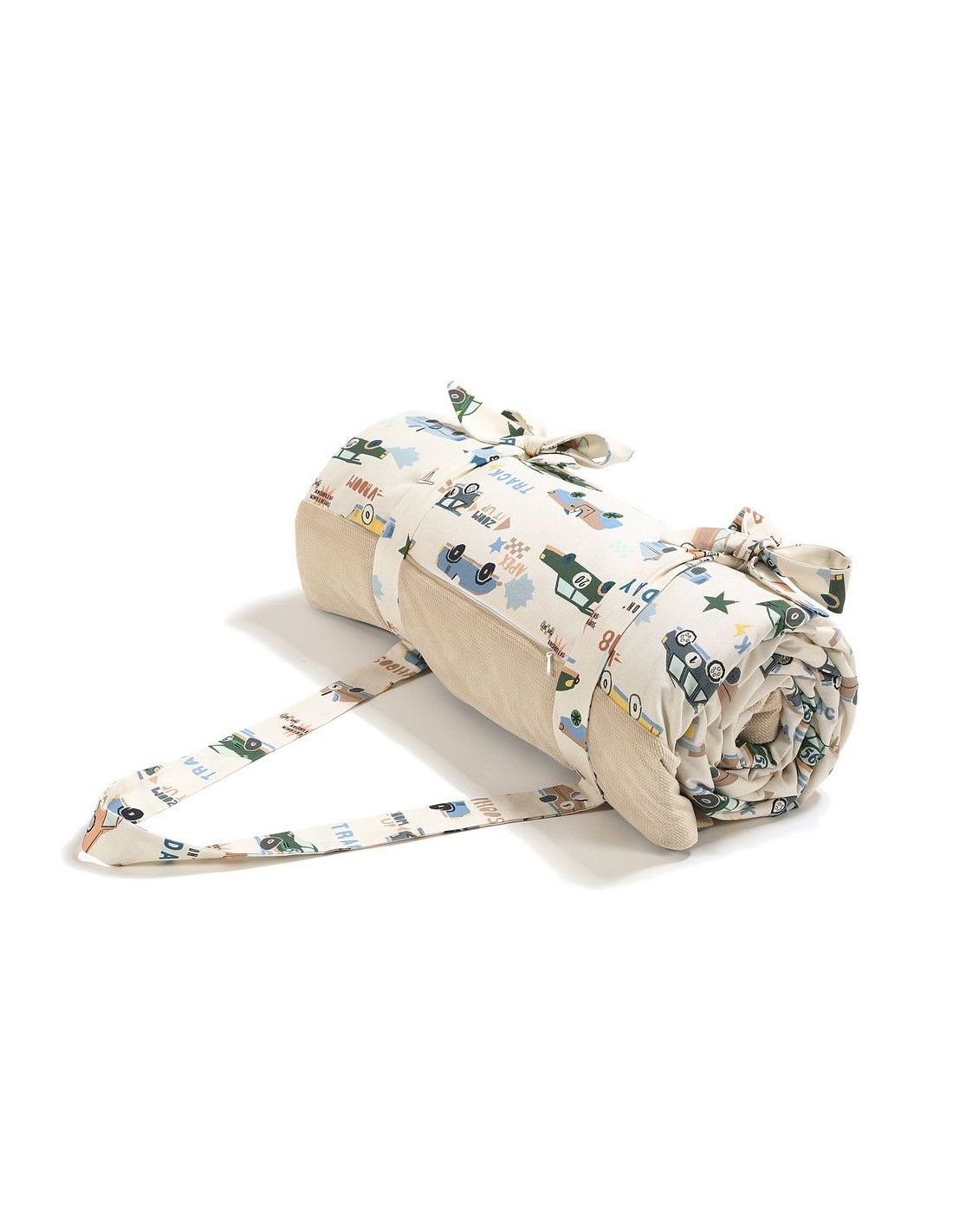 - Materiały: Wykonany z 100% bawełny, z nadrukiem posiadającym Certyfikat OEKO-TEX 100 klasa I. Spód koca wykonany z wodoodpornego ortalionu, co umożliwia używanie go również na wilgotnym podłożu.