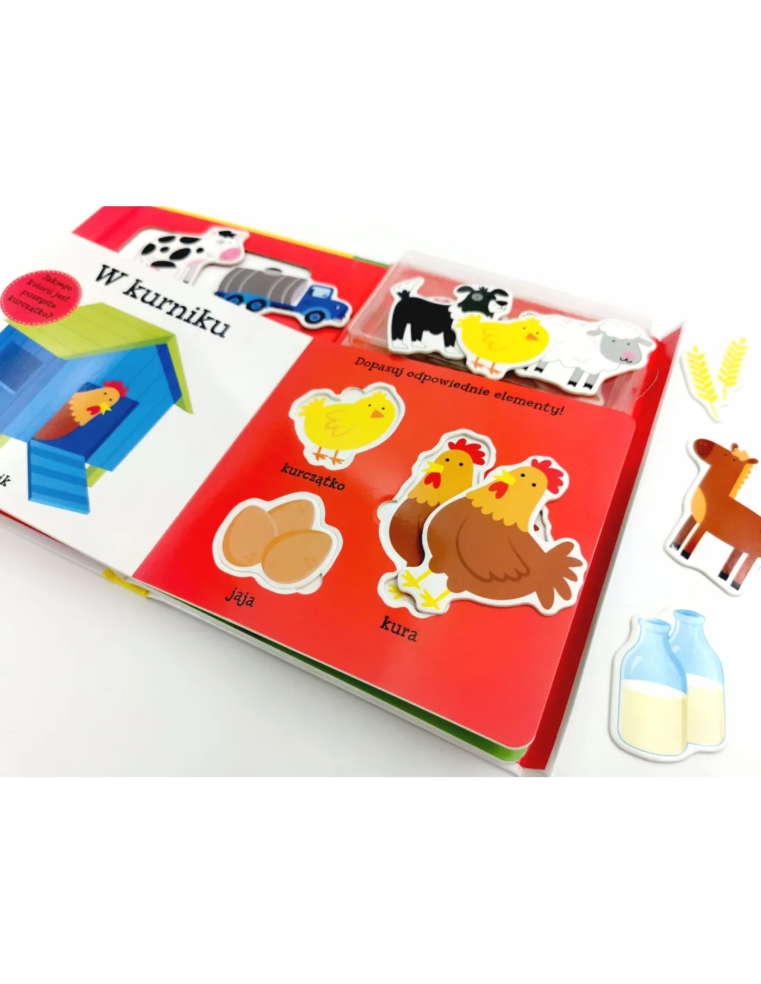 Interaktywne zadania – na każdej stronie dziecko może wskazywać zwierzęta i przedmioty, dopasowywać puzzle oraz naśladować dźwięki z farmy.