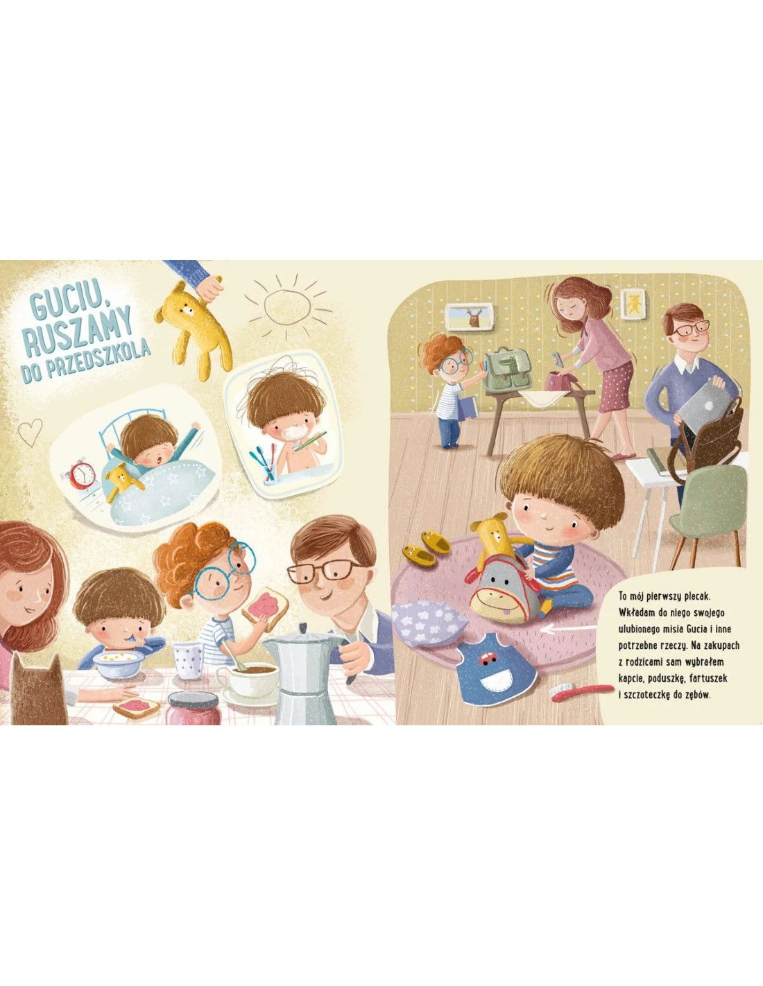 Feluś wraz z rodzicami przygotowuje się na swoją wielką przygodę - pierwszy dzień w przedszkolu. Razem wybierają najważniejsze rzeczy: plecak, kredki, oraz niezastąpionego towarzysza, pluszowego misia Gucia. Wyruszają w nieznane, gotowi na nowe doświadczenia.