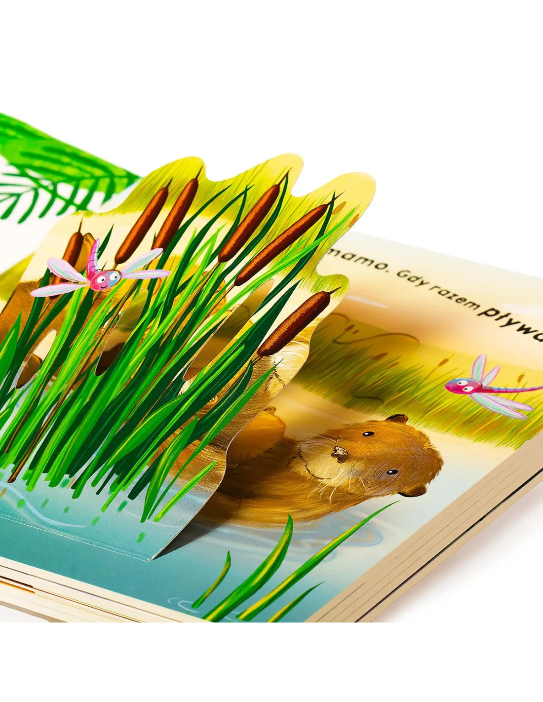 Ruchome elementy i interaktywna zabawa – dziecko przesuwa, obraca i odkrywa elementy książki, rozwijając motorykę małą i koordynację ręka-oko.