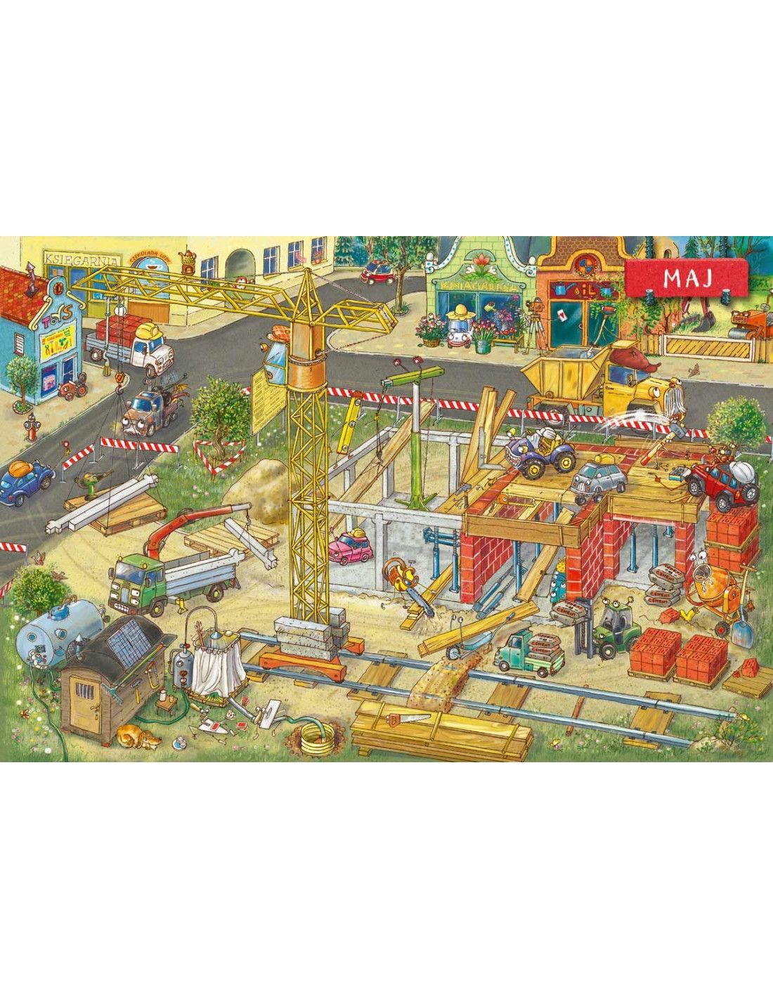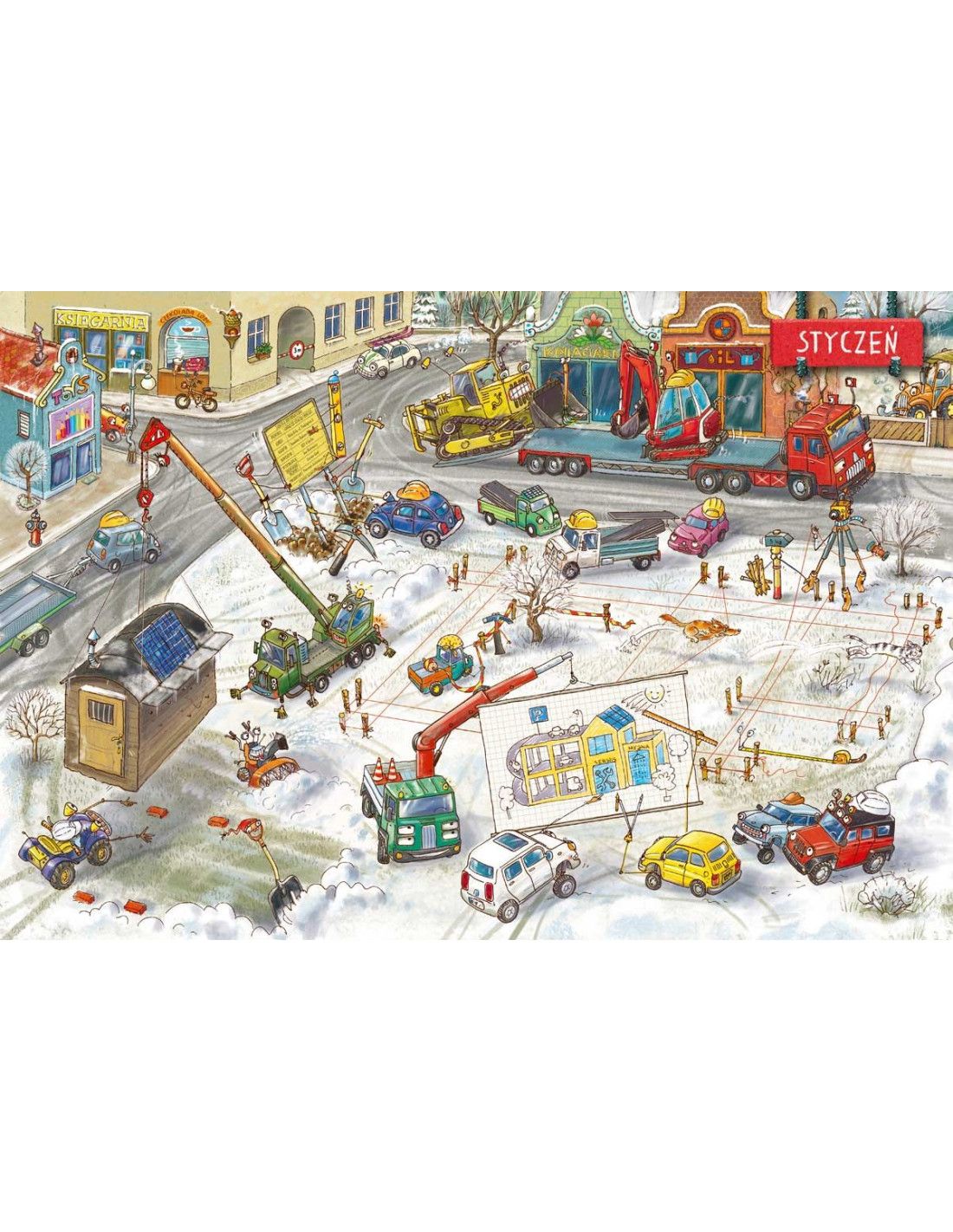 „Rok na placu budowy” składa się z dwunastu rozkładówek przedstawiających kolejne miesiące pracy na placu budowy, a także dwóch dodatkowych stron poświęconych prezentacji bohaterów oraz interaktywnej zabawie. Młodzi fani motoryzacji będą mogli śledzić postępy maszyn budowlanych, a każdy miesiąc przyniesie nowe wyzwania i zmiany na placu budowy.