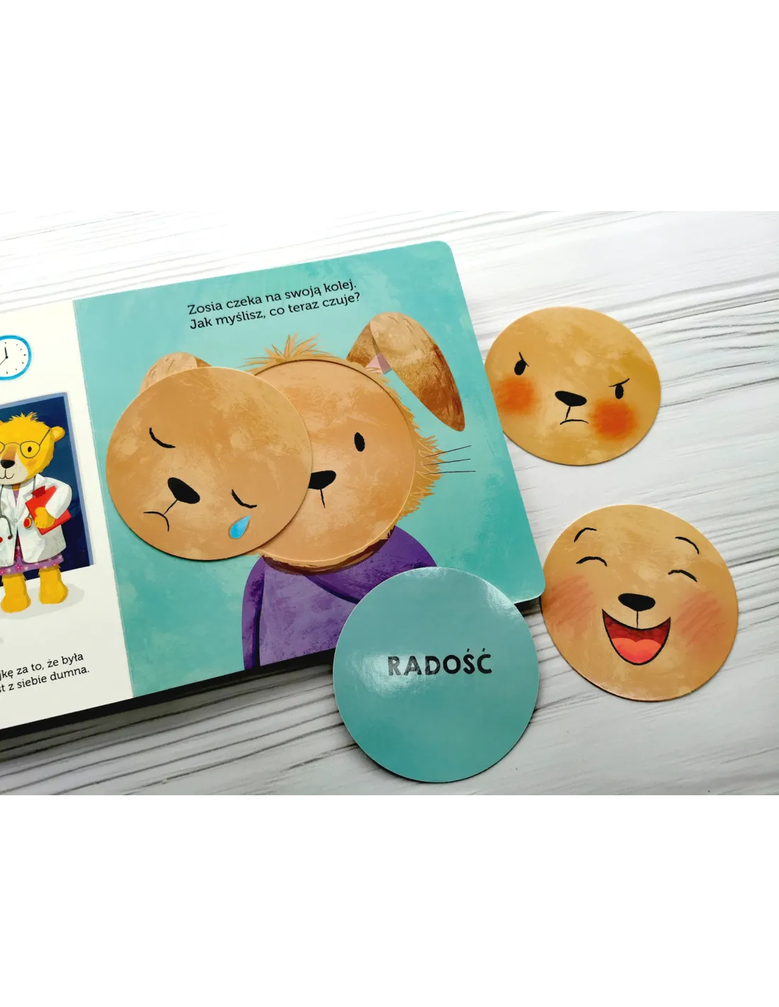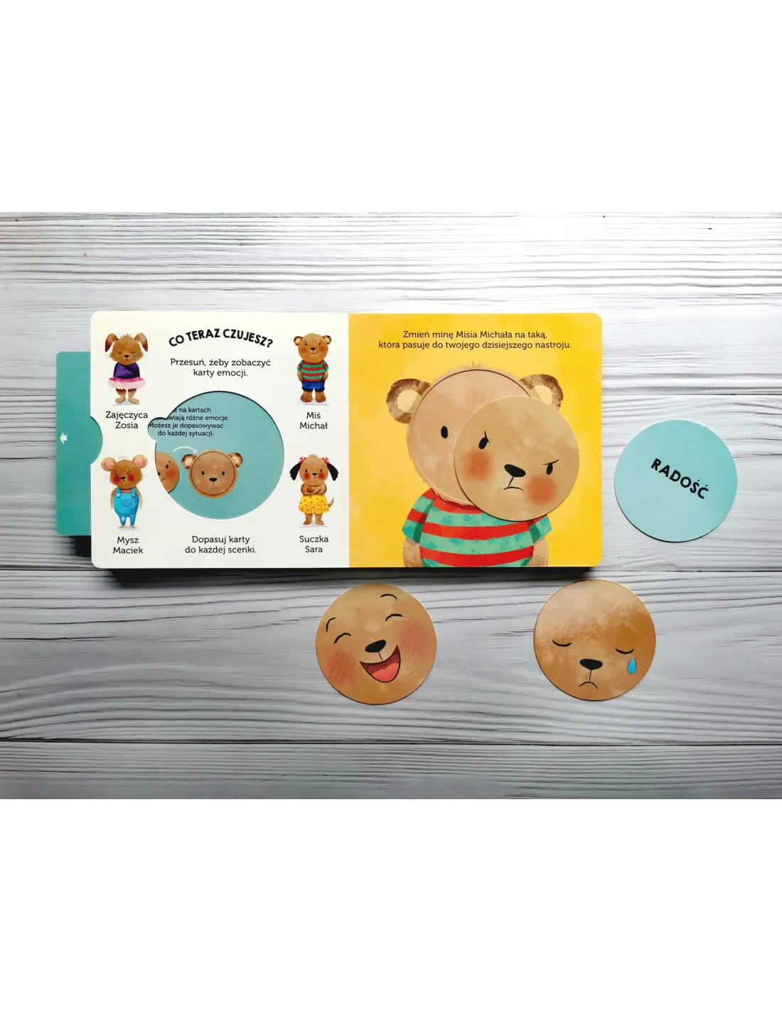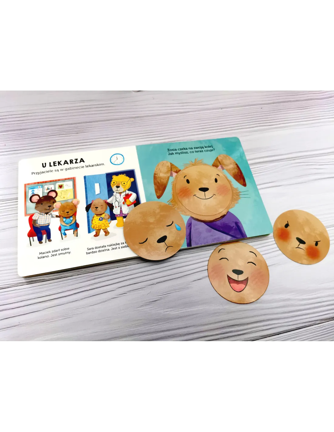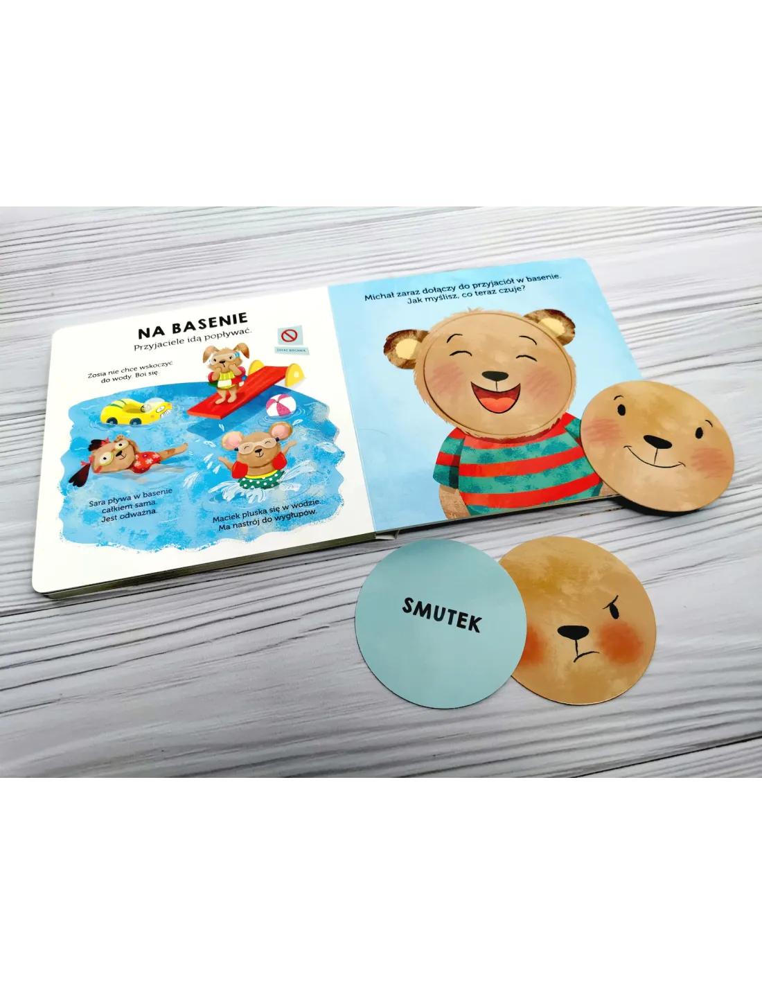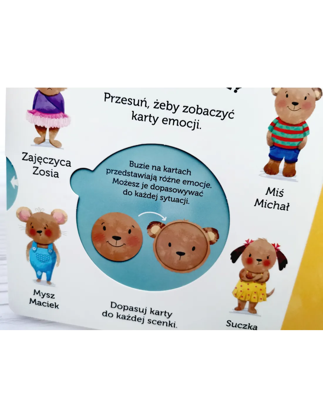 Interaktywna zabawa – do książki dołączone są 4 karty z buźkami emocji, które dziecko dopasowuje do odpowiednich sytuacji w książce.