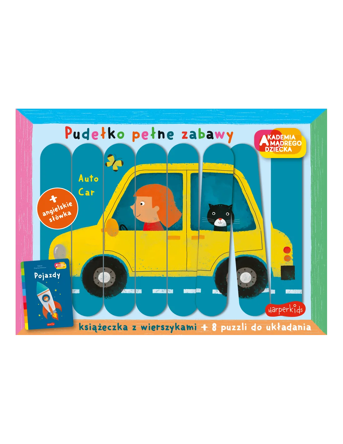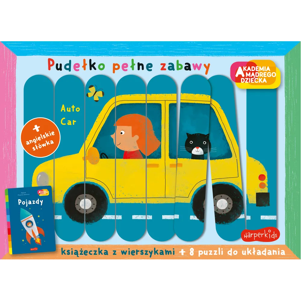 „Pojazdy. Akademia mądrego dziecka. Pudełko pełne zabawy” to wyjątkowy zestaw edukacyjny stworzony z myślą o najmłodszych dzieciach, który łączy naukę słów, rozwój motoryki i kreatywną zabawę.