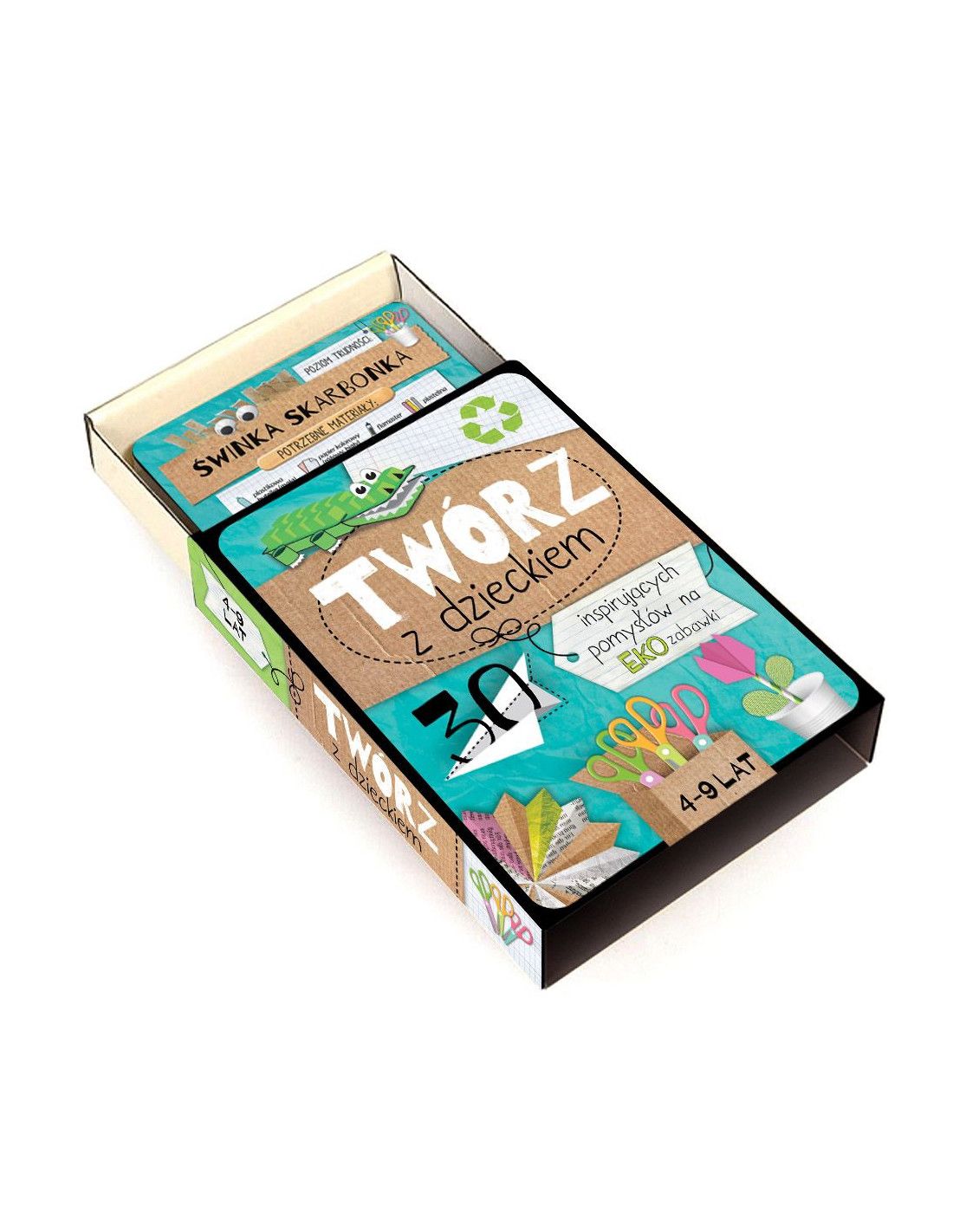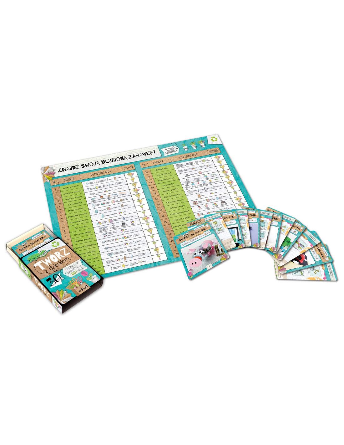 "Twórz z dzieckiem" to niezwykły zestaw 30 kart, zatytułowany "30 inspirujących pomysłów na eko zabawki", które przekształcą kreatywność Twojego dziecka w niezapomnianą rodzinną zabawę. Ta książka udowodni dzieciom, że zabawki nie muszą pochodzić z hipermarketów ani być drogimi gadżetami. Możemy je stworzyć samodzielnie, korzystając z prostych, dostępnych materiałów, jednocześnie ucząc naszych najmłodszych, jak ważne jest dbanie o środowisko.