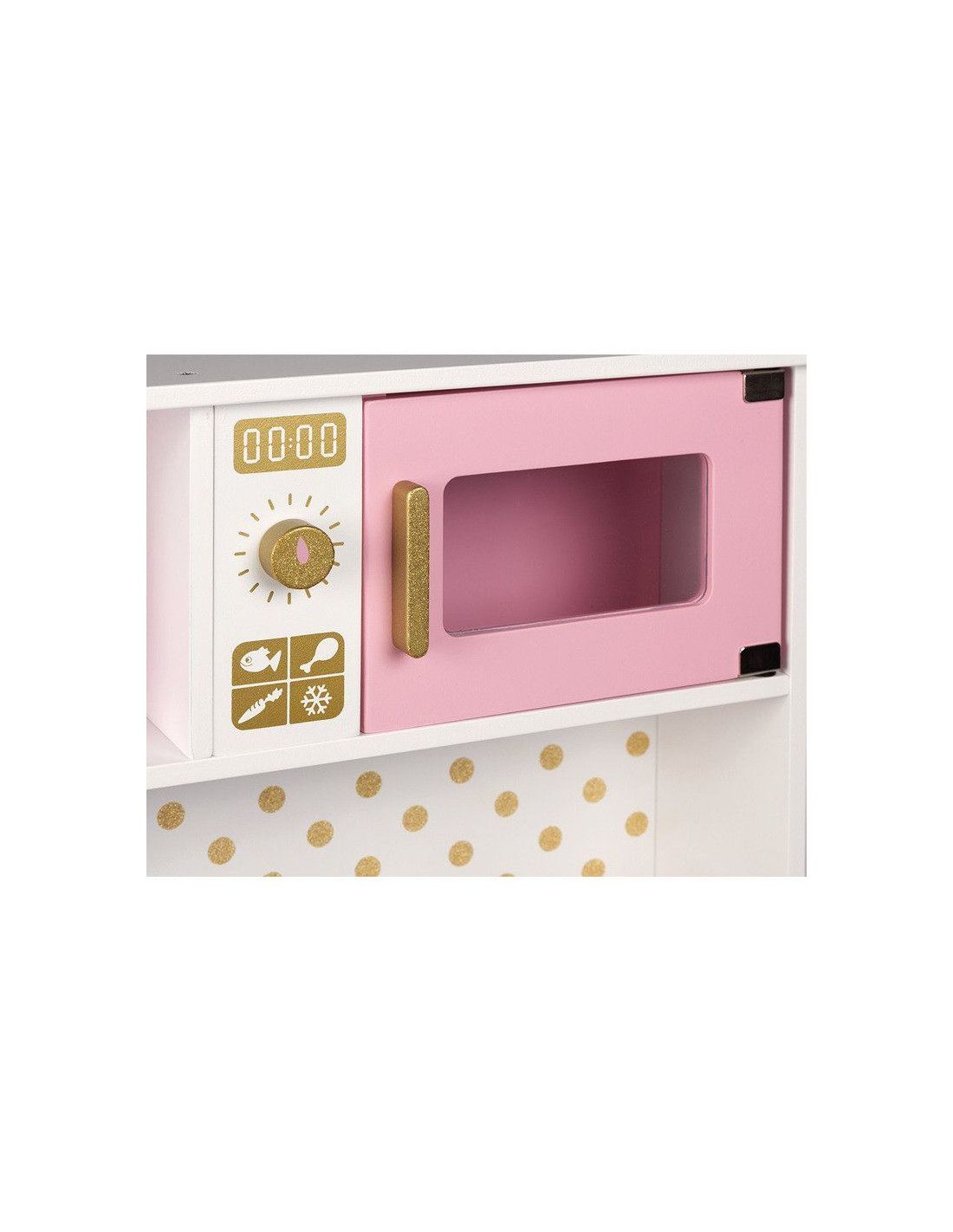 Wyposażona jest w okrągły, metalowy zlew, dwa „elektryczne” palniki, piekarnik, dolną szafkę, górną półkę, mikrofalę oraz różowy wieszak z 3 haczykami i zegarem. Całości szyku dodają połyskujące złote detale, takie jak pokrętła, uchwyty, wskazówki zegara i ozdobne grochy na tylnej ściance kuchni.