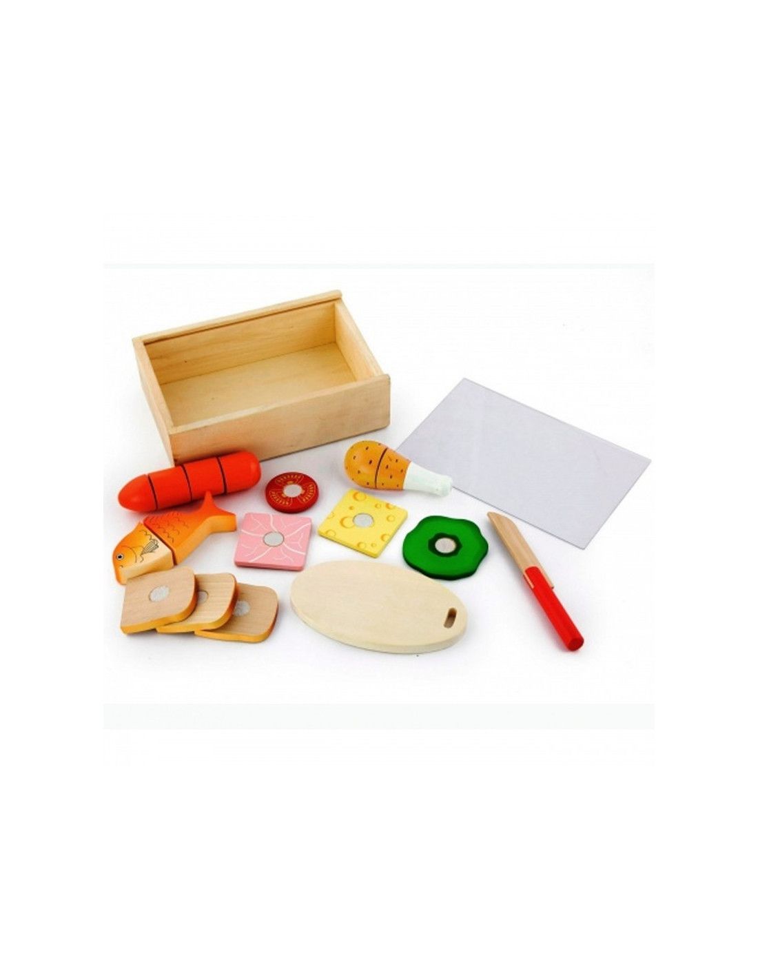 W skład kompletu wchodzi: deska do krojenia, nożyk, arbuz, marchewka, pomidor, bakłażan, grzybek, czosnek, gruszka, banan, jabłko, rybka, udko kurczaka.