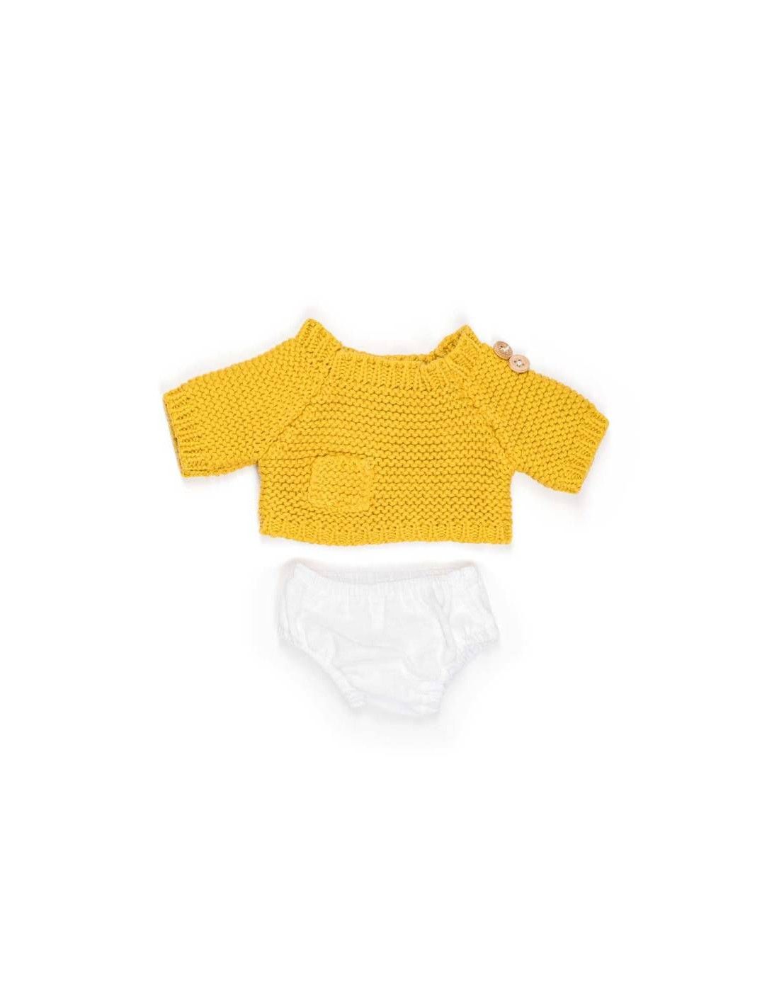 - Zestaw ubrań: Komplet składa się z musztardowego sweterka oraz białych majteczek, tworząc modny i praktyczny strój dla lalki.