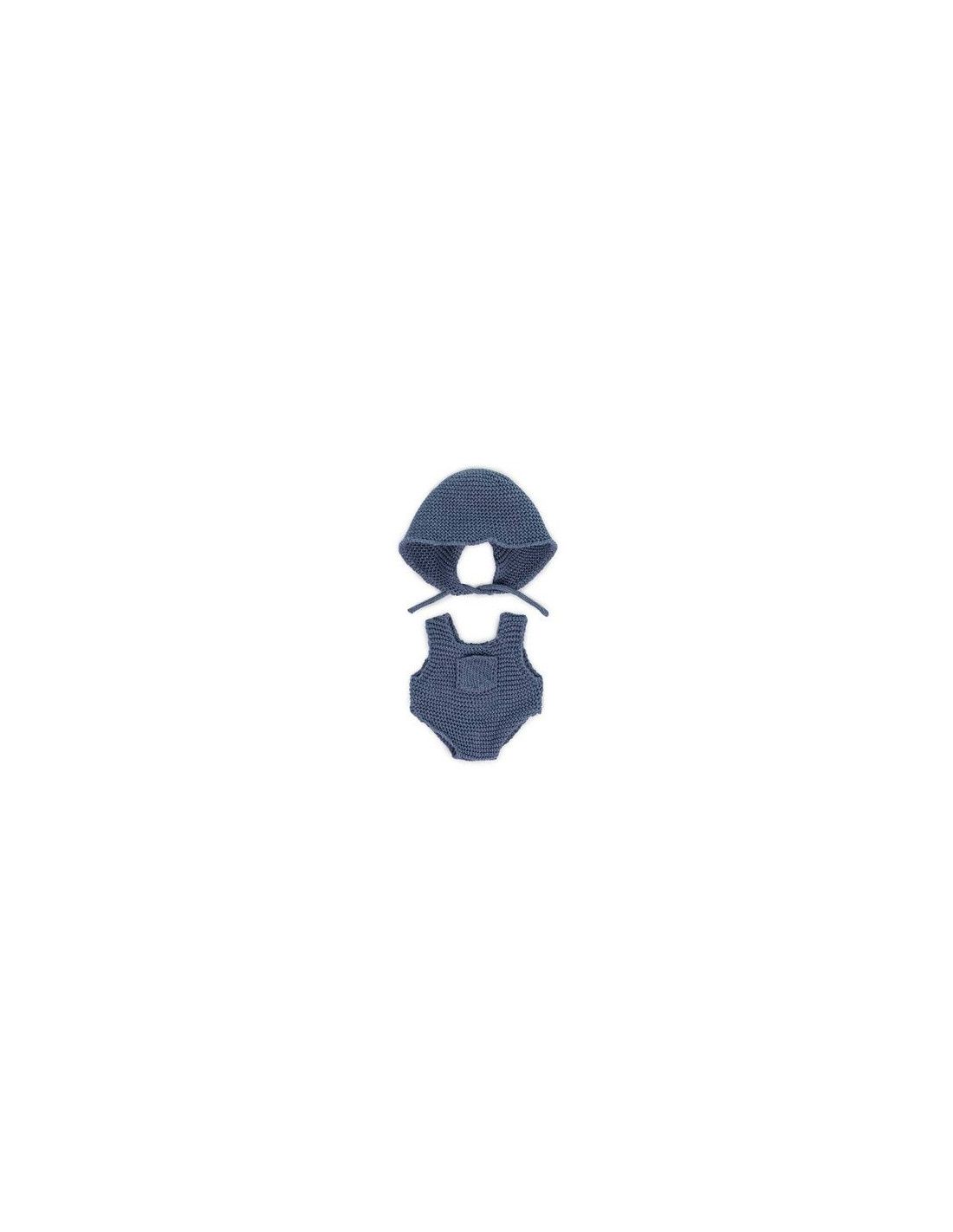 Stylowy i miękki dzianinowy komplet dla lalek Miniland o wysokości 21 cm. W skład zestawu wchodzi granatowy rompers oraz dopasowana czapeczka, które dodają lalce uroku i elegancji.
