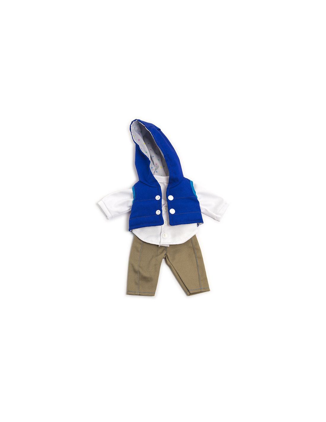Zestaw odzieżowy dla lalek Miniland o wysokości 32 cm, składający się z brązowych spodni, białej bluzy i granatowego bezrękawnika z kapturem.