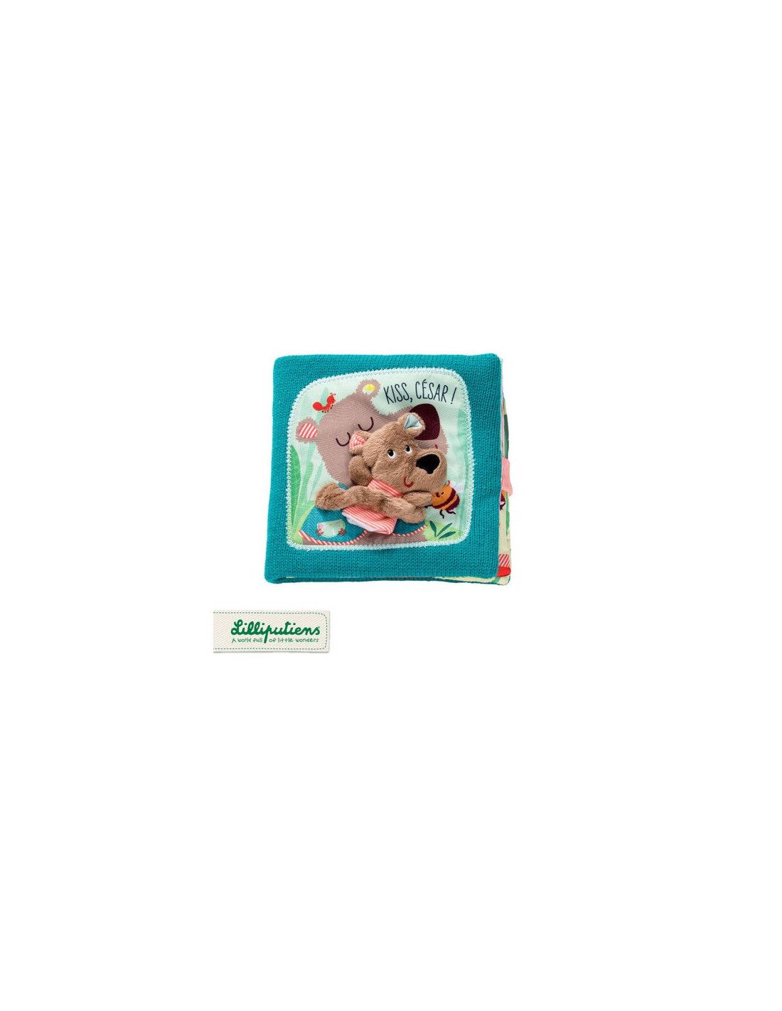 Książeczka „Buziaki dla Cezara” z kolekcji Niedźwiadek Cesar belgijskiej marki Lilliputiens to idealna pierwsza lektura dla maluszka. Książeczka ma przyjemną w dotyku okładkę, do której dołączona jest mini-pacynka Niedźwiadek Cesar w piżamce, którego można „ożywiać” po wsunięciu go na palec. Każda ze stron książeczki przedstawia inne zwierzątko – m.in. lisiczkę, lemura, słonia czy pszczołę, któremu niedźwiadek daje buziaka i do którego przytula się przed snem (na okładce jest w ramionach swojej mamy). Łapki zwierzątek są puchate i wystają ze stron książeczki, są też odpowiednio długie, by każde stworzenie mogło objąć małego Cesara. Kolorowe obrazki doskonale nadają się do snucia opowieści i łatwo zapadają w pamięć. Na szeleszczącej stronie na końcu książeczki znajduje się specjalne miejsce na zdjęcie dziecka, aby również ono mogło zostać jej bohaterem i zasnąć w hamaku obok niedźwiadka. Książeczka jest zapinana na rzep, perfekcyjnie wykończona, z dbałością o każdy szczegół i w pełni bezpieczna dla dziecka. Pobudza dziecięcą wyobraźnię i ciekawość, aktywizuje zmysły wzroku, dotyku i słuchu. Jest także świetnym sposobem na zaszczepienie w maluszku miłości do książek i... samodzielnego zasypiania!