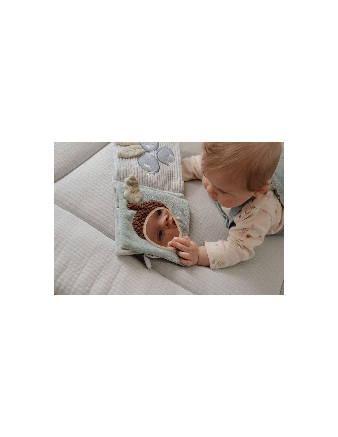 - Elementy interaktywne: W książeczce znajdziesz grzechotkę, szeleszczące elementy, metki oraz uwielbiane przez dzieci lusterko.