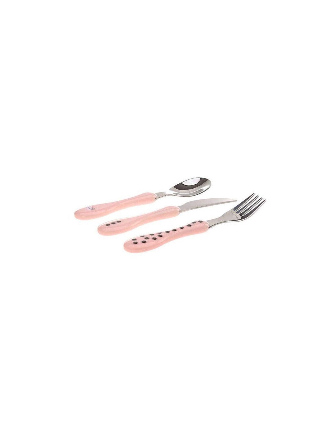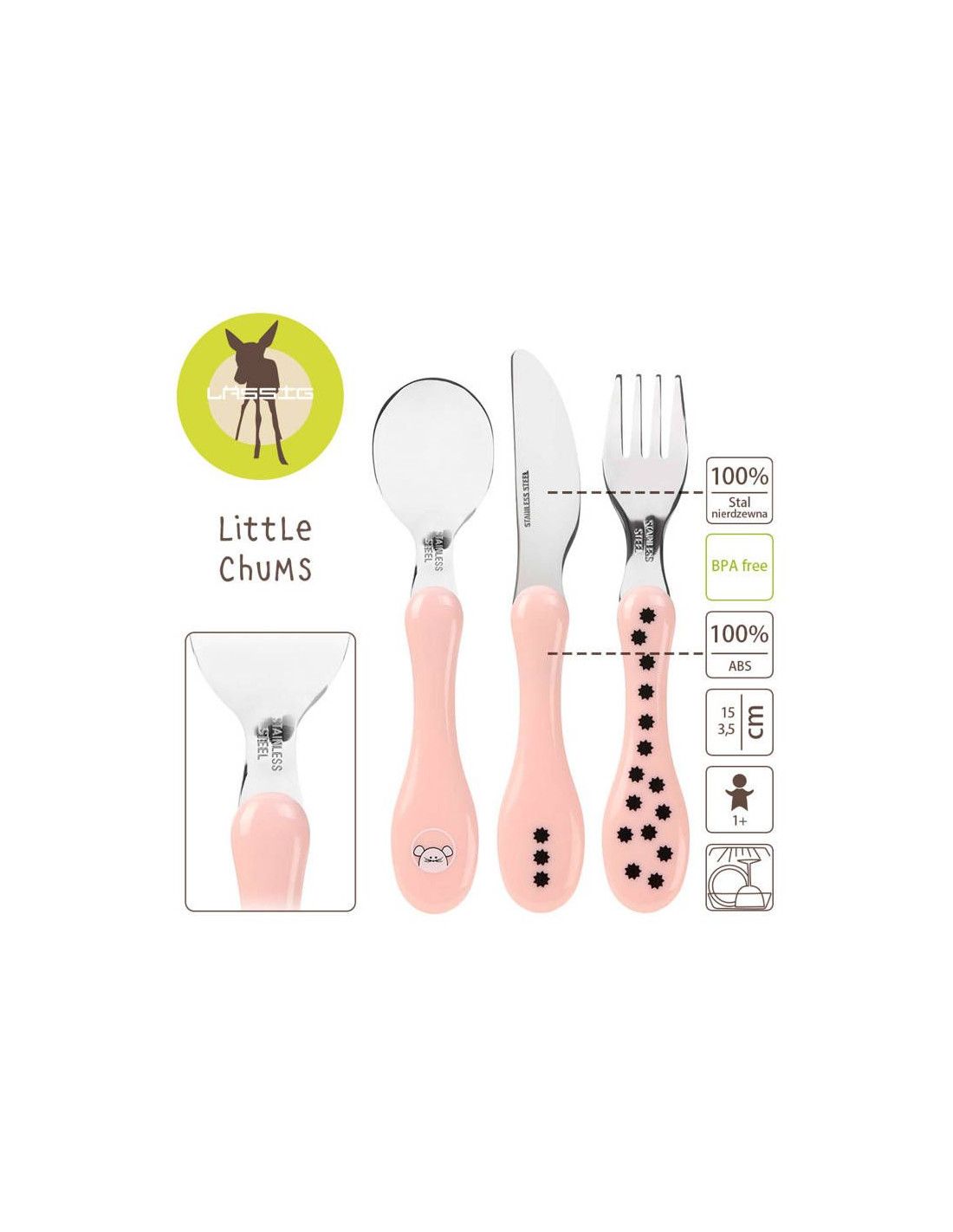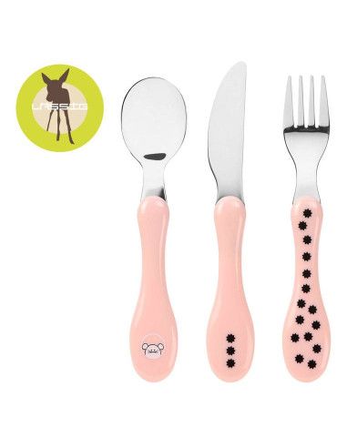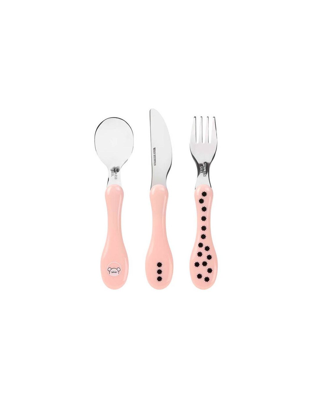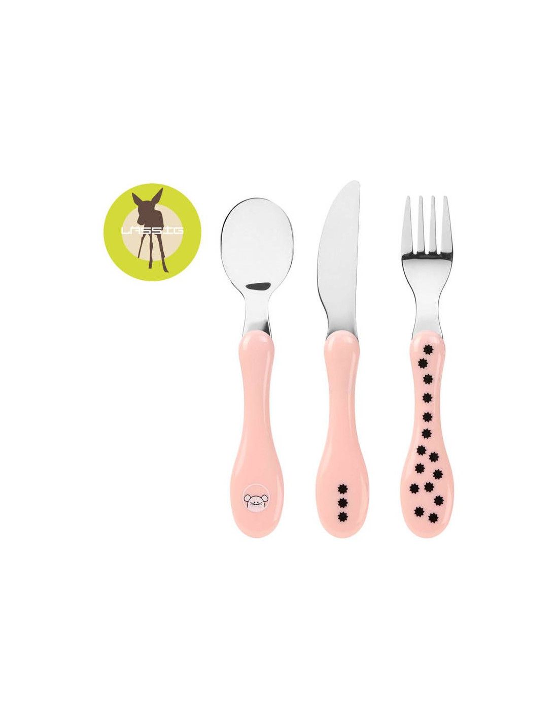 Komplet sztućców ze stali nierdzewnej niemieckiej marki LASSIG, składający się z widelca, łyżki i noża. Są lekkie i mają specjalnie profilowane kształty, co ułatwia dzieciom nabieranie pożywienia. Rękojeść z tworzywa – w pastelowym odcieniu różu, z motywem czarnych gwiazdek na widelcu i nożu oraz przyjaznego mysiego pyszczka na łyżce – również została zaprojektowana tak, by idealnie pasować do dziecięcej rączki. Dzięki przewężeniu łatwo ją złapać i utrzymać.