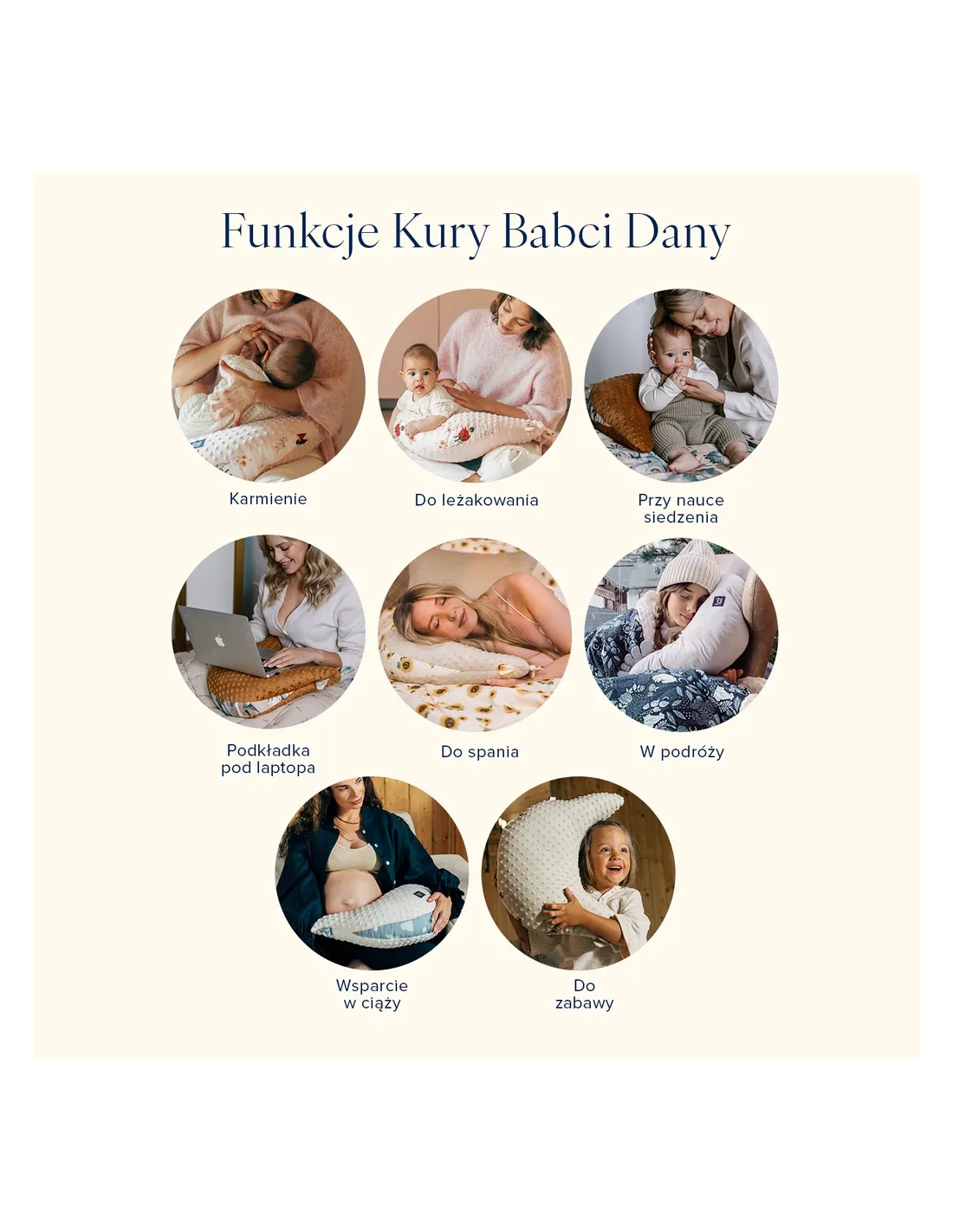 Dzięki swojej uniwersalności, poduszka do karmienia Kura Babci Dany świetnie sprawdzi się również jako podkładka pod laptopa, poduszka podróżna czy dekoracja wnętrza.