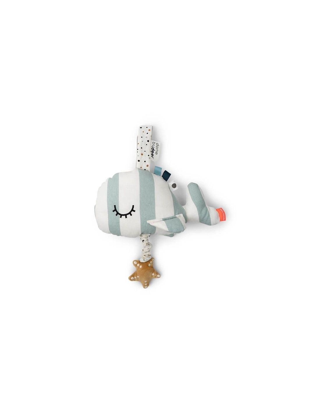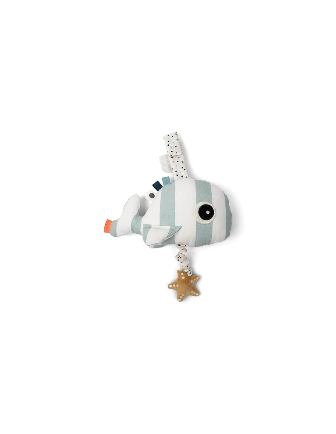 Śliczna muzyczna zabawka może stać się elementem dekoracyjnym dziecięcego pokoju. Można ją łatwo przymocować w dowolnym miejscu dzięki pętelce na rzep. Śpiący wieloryb w niebieskie paski ma urocze detale – kontrastujące z nim kropki i miękką w dotyku rozgwiazdę. Uspokoi malucha, gdy nadejdzie czas na relaks lub odjazd do krainy sennych marzeń.