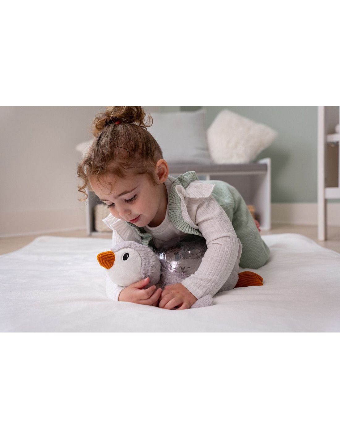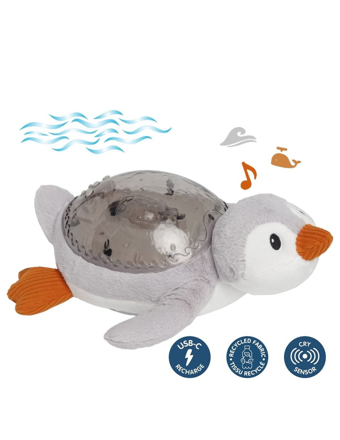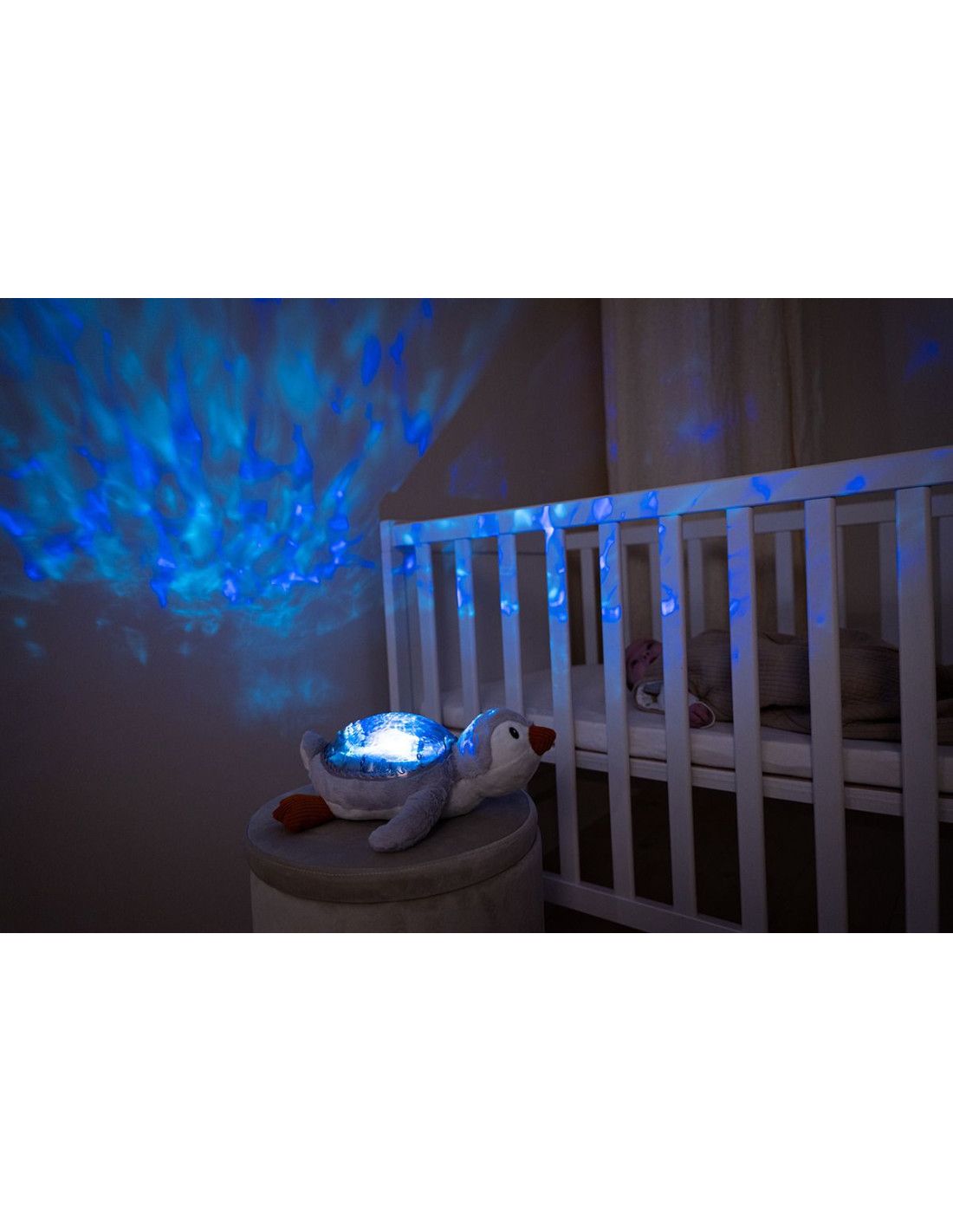 W ciągu dnia Pingwin pełni rolę miękkiego przyjaciela, a w nocy zmienia się w lampkę nocną. Projektor wytwarza delikatne światło w dwóch kolorach, tworząc magiczną aurę, która uspokaja i wprowadza dziecko w stan relaksu. Cztery kojące dźwięki, w tym spokojne melodie oraz dźwięki oceanu, takie jak śpiew wieloryba i szum fal, pomagają maluchowi zasnąć, a regulowana głośność pozwala dostosować poziom dźwięku do indywidualnych potrzeb.
