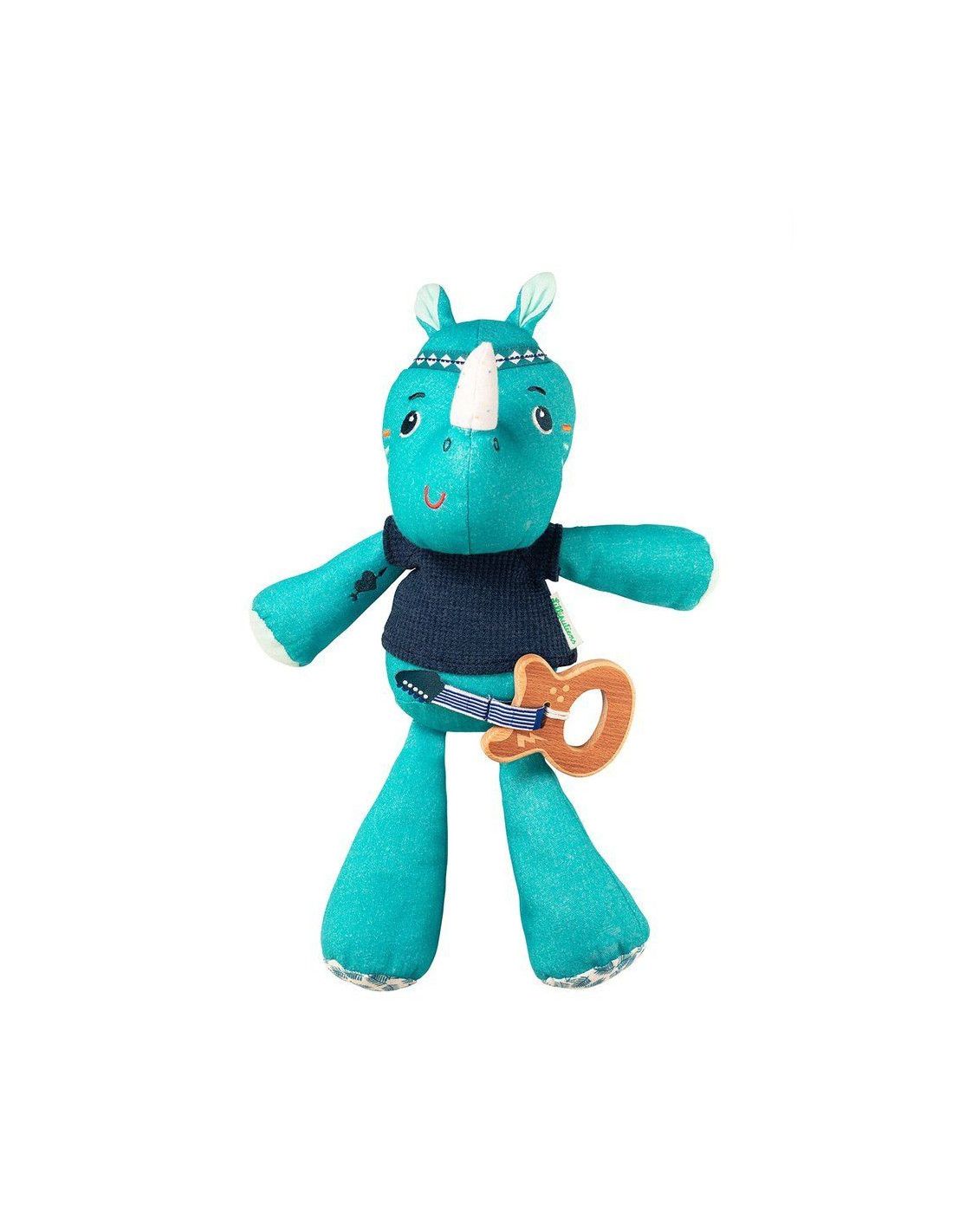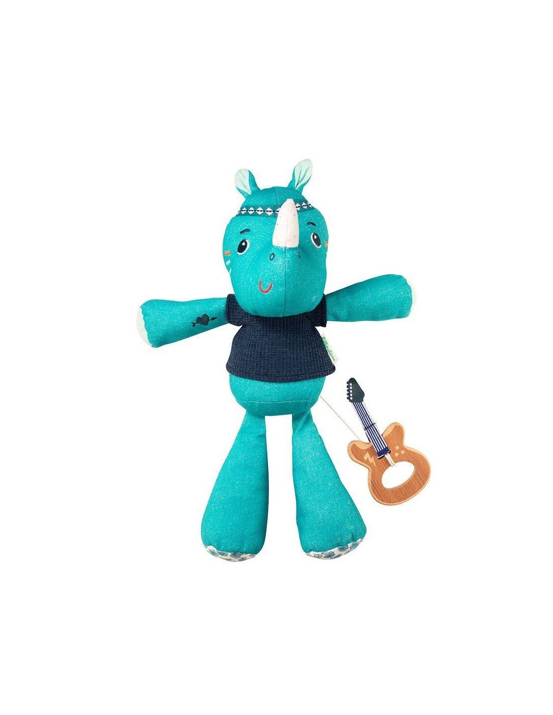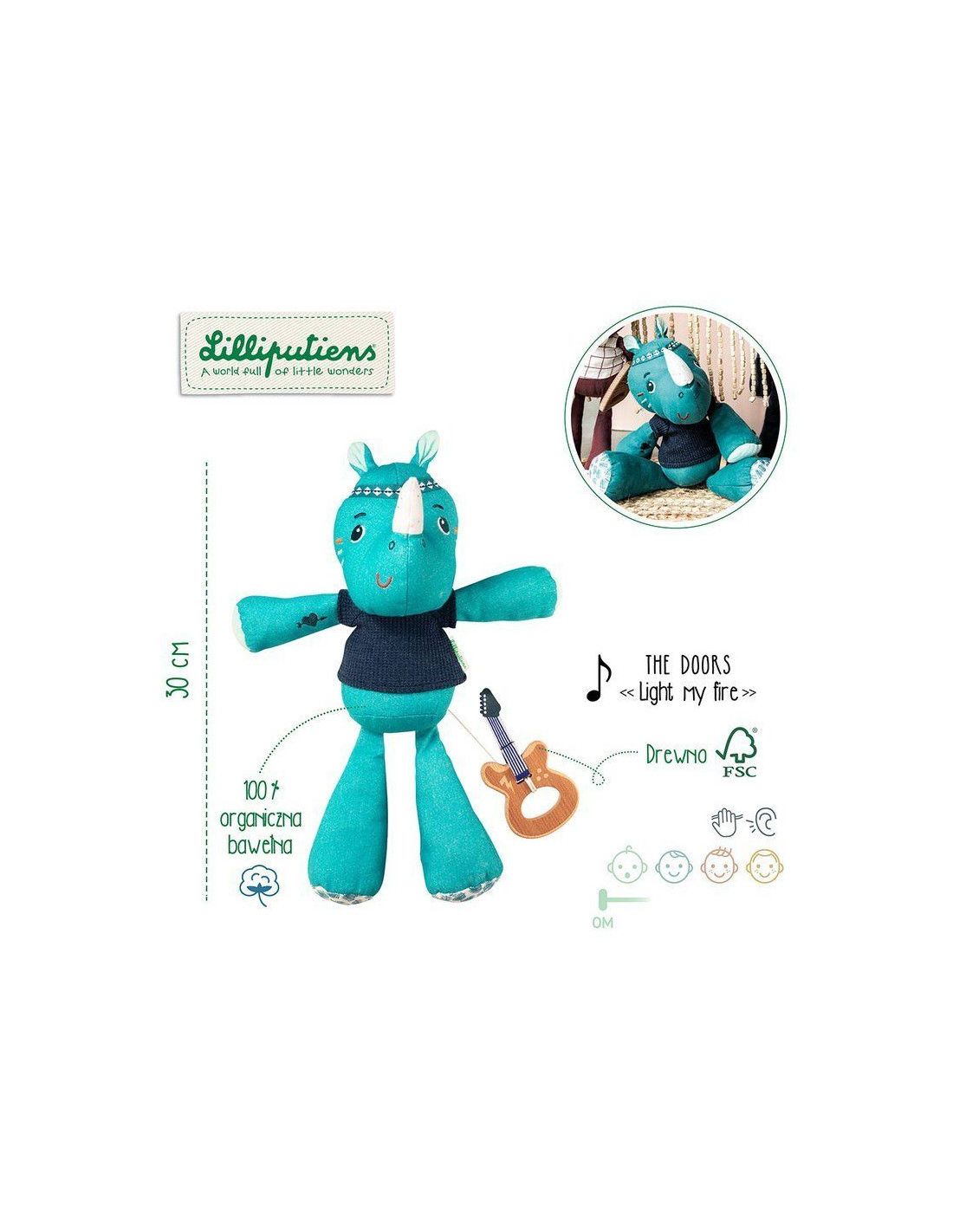 Duża przytulanka z pozytywką Nosorożec Marius belgijskiej marki Lilliputiens to wspaniały pierwszy przyjaciel maluszka. Jest idealny do tulenia, uspokajania i usypiania. Ma postać radosnego niebieskiego Nosorożca Mariusa, aż 30 cm wysokości i drewnianą gitarę elektryczną, która stanowi jednocześnie uchwyt ukrytej wewnątrz pozytywki. Pociągniecie za instrument uaktywnia znaną, przyjemną dla ucha melodię utworu zespołu The Doors „Light my fire”. Muzykujący Marius nosi dzianinowy t-shirt, został uszyty z delikatnej bawełny organicznej, na głowie ma opaskę z tasiemki, a na ramieniu – wyszywany tatuaż. Zabawka jest solidnie wykonana i bezpieczna. Wyposażona w troczki, które umożliwiają jej powieszenie przy łóżeczku czy wózku dziecka. Zaskakuje i pobudza dziecięcą wyobraźnię. Aktywizuje zmysł słuchu, pomaga w zasypianiu i wyciszaniu się.
