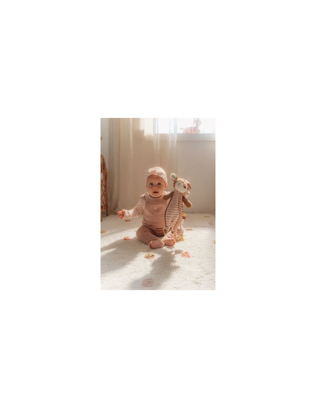 Miękka sarenka wykonana z przyjemnego materiału w prążek jest idealna do przytulania, a jej uroczy haft dodaje jej wyjątkowego uroku. Dzięki łatwym do chwytania supełkom i pętelce do przymocowania smoczka, przytulaczek jest bardzo funkcjonalny. Wypustki i metki pobudzają zmysły dziecka, wspierając jego rozwój.