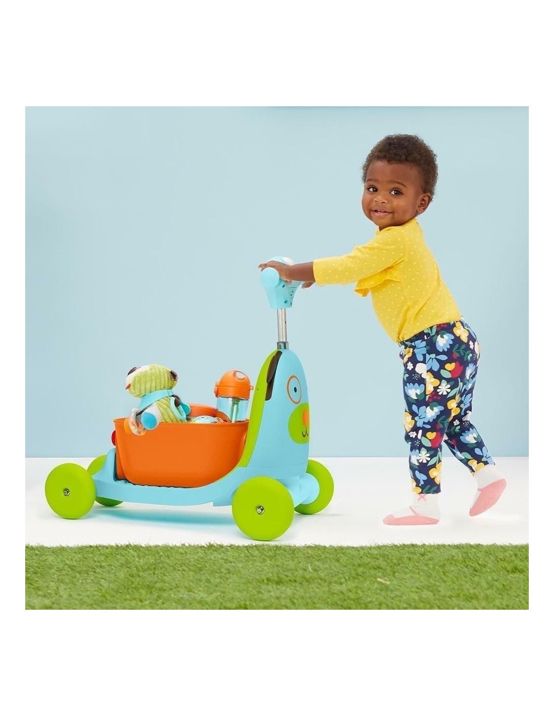 Zaprojektowana, by rosnąć razem z dzieckiem na 3 etapach. Urocza i kolorowa hulajnoga zapewnia dziecku wspaniałą zabawę, jednocześnie zachęcając do rozwijania umiejętności motorycznych, ćwiczenia równowagi i koordynacji. Etap pierwszy, zaprojektowany dla dzieci, które dopiero zaczynają chodzić, zachęca maluchy do korzystania z zabawki jako pchacza, w którym mogą wozić swoje ulubione zabawki. Na drugim etapie wystarczy obrócić pojemnik na zabawki, żeby mógł stać się siedziskiem – mamy jeździk! Gotowi na trzeci etap? Zdejmijcie siedzisko, podciągnijcie rączkę i można ruszać na szaloną przejażdżkę! Każde dziecko będzie zachwycone przyciskiem uruchamiającym światła i efekty dźwiękowe w czasie jazdy.