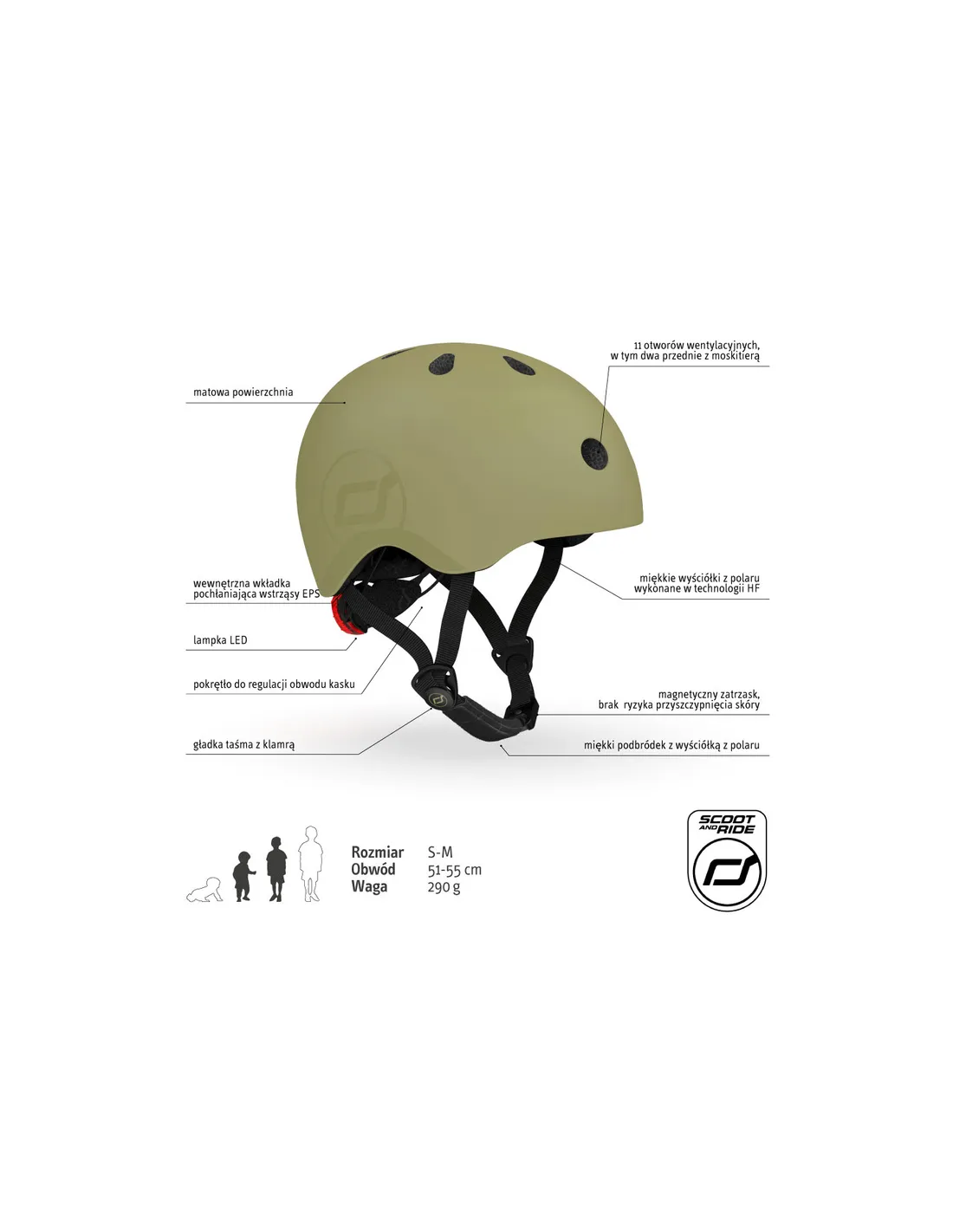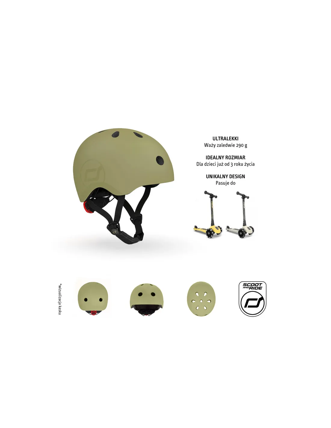 Kask dziecięcy SCOOT&RIDE S-M Olive to ultralekki (zaledwie 290 g) i bezpieczny kask ochronny dla dzieci od 3 lat, idealny na hulajnogę, rowerek biegowy, jeździk i rower.