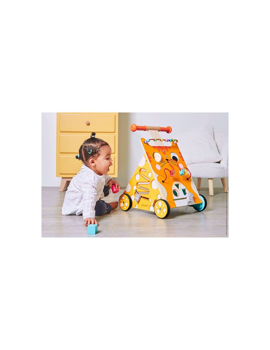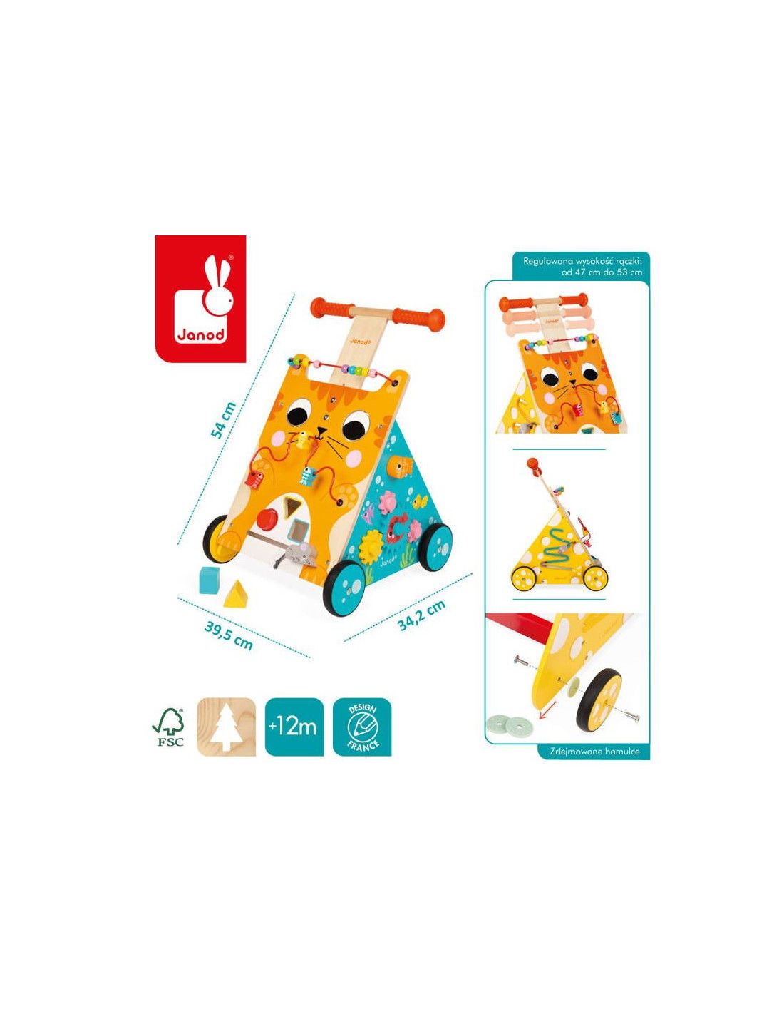 Wielofunkcyjny pchacz edukacyjny Kot francuskiej marki JANOD to doskonała zabawka, która nie tylko wspiera dziecko w stawianiu pierwszych kroków, ale również stymuluje jego ogólny rozwój motoryczny. Trzy kolorowe ścianki pchacza – pomarańczowa, żółta i niebieska – oferują różnorodne atrakcje, które przyciągną uwagę malucha i zapewnią mu długie godziny zabawy.