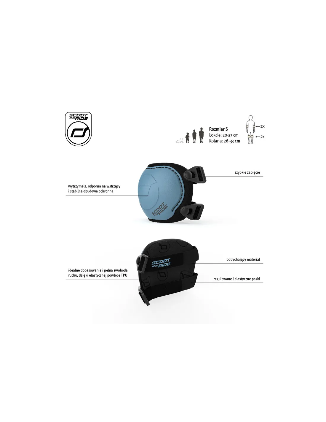 Dzięki regulowanym rzepom ochraniacze Scoot & Ride łatwo dopasujesz, by dobrze trzymały się na ciele i nie uciskały. Jeśli dziecko ma mniejsze stawy, polecamy rozmiar XS.