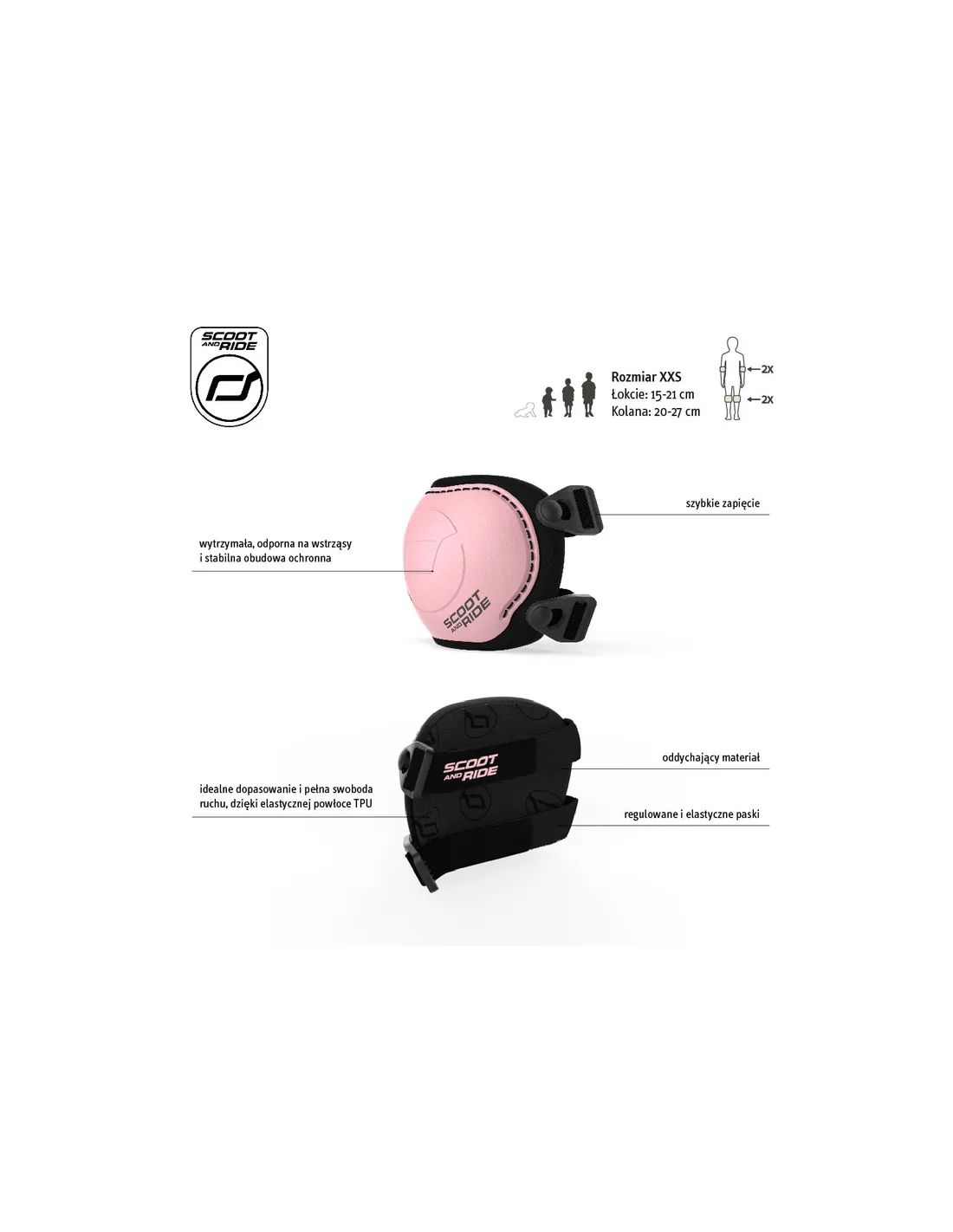 Zestaw ochraniaczy SCOOT&RIDE XXS Rose to bezpieczne i wygodne ochraniacze dla dzieci na kolana i łokcie, idealne na hulajnogę, rower, deskorolkę i rolki.