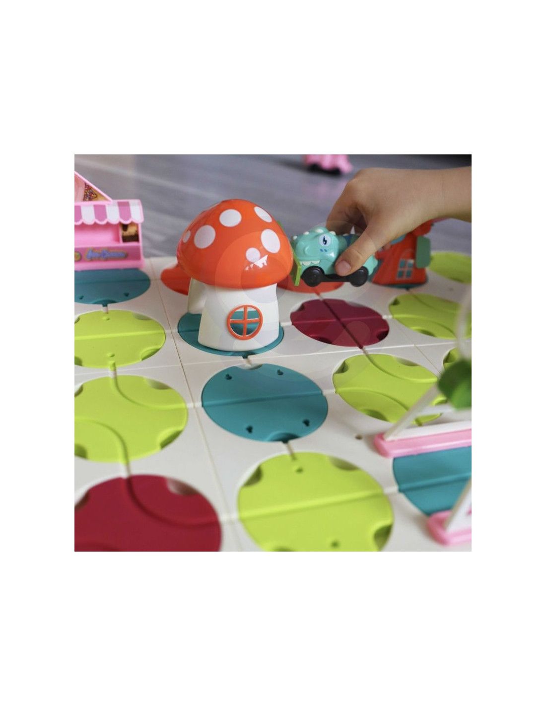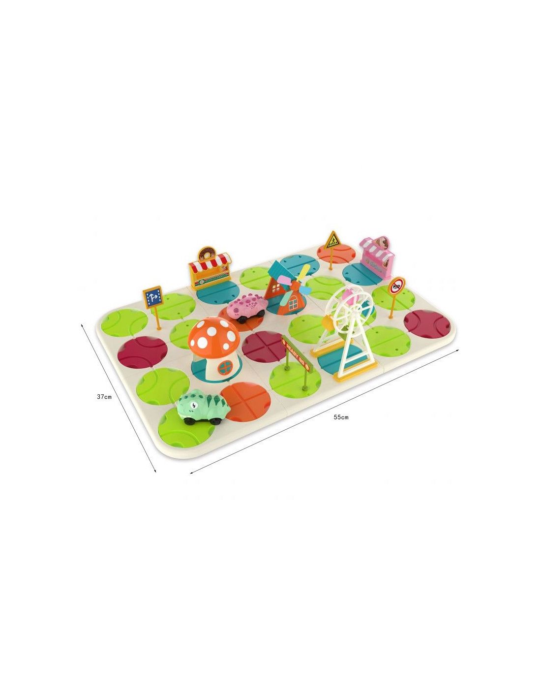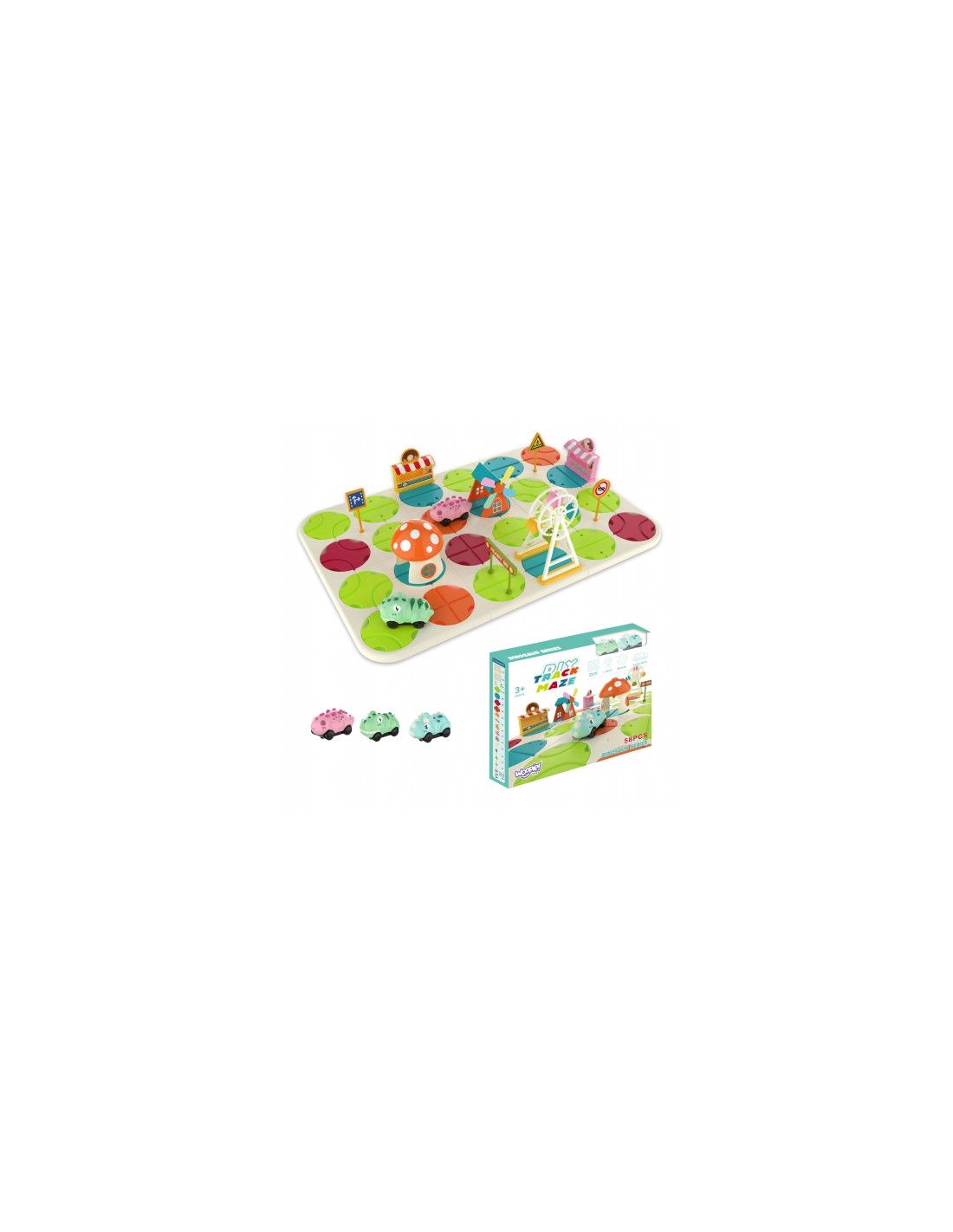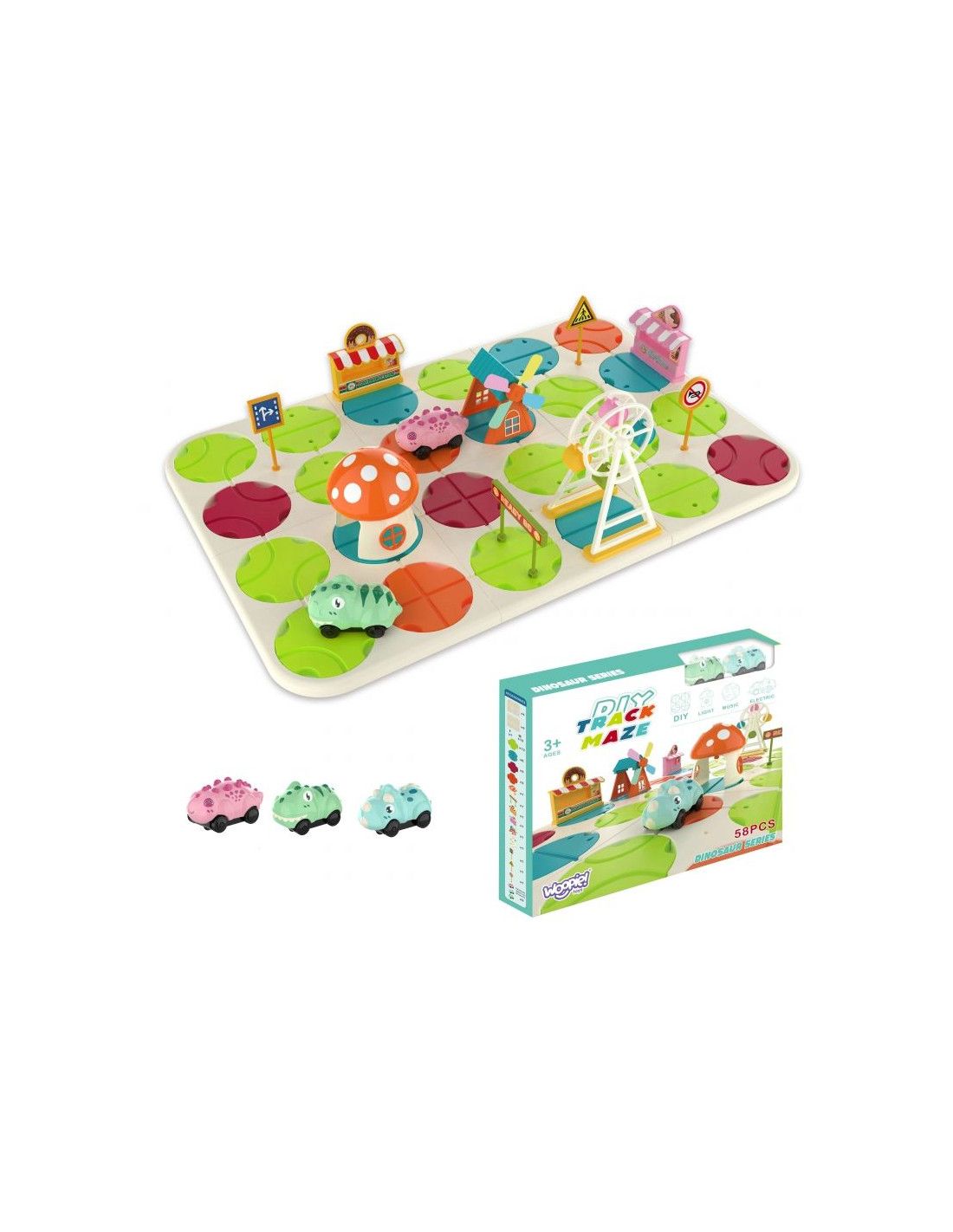 Interaktywny Tor Samochodowy Miasto i Dinozaury od marki WOOPIE da dziecku nieskończone możliwości zabawy. Zabawa polega na ułożeniu trasy dla elektrycznych samochodów. Autka, gdy się puści to jeżdżą same. Podczas jazdy można zmieniać kierunki tras, aby samochodziki jeździły różnie i w nieskończoność. Zestaw zawiera aż 58 el. i dziecko może dowolnie ustawiać różnego rodzaju elementy drogowe i budowle jak np. młyn znaki drogowe, lodziarnie, wesołe miasteczko, domek grzybek itp. Dodatkowo, gdy samochodziki przejedzie przez domek grzybek to ten wydaje efekty świetlne i dźwiękowe. W zestawie znajdują się 2 autka elektryczne dinozaury. Zestaw jest łatwy w montażu. Zabawka niezwykle pobudzi umysł dziecka, rozwinie jego zdolności manualne i pobudzi wyobraźnie oraz kreatywne i nieszablonowe myślenie.