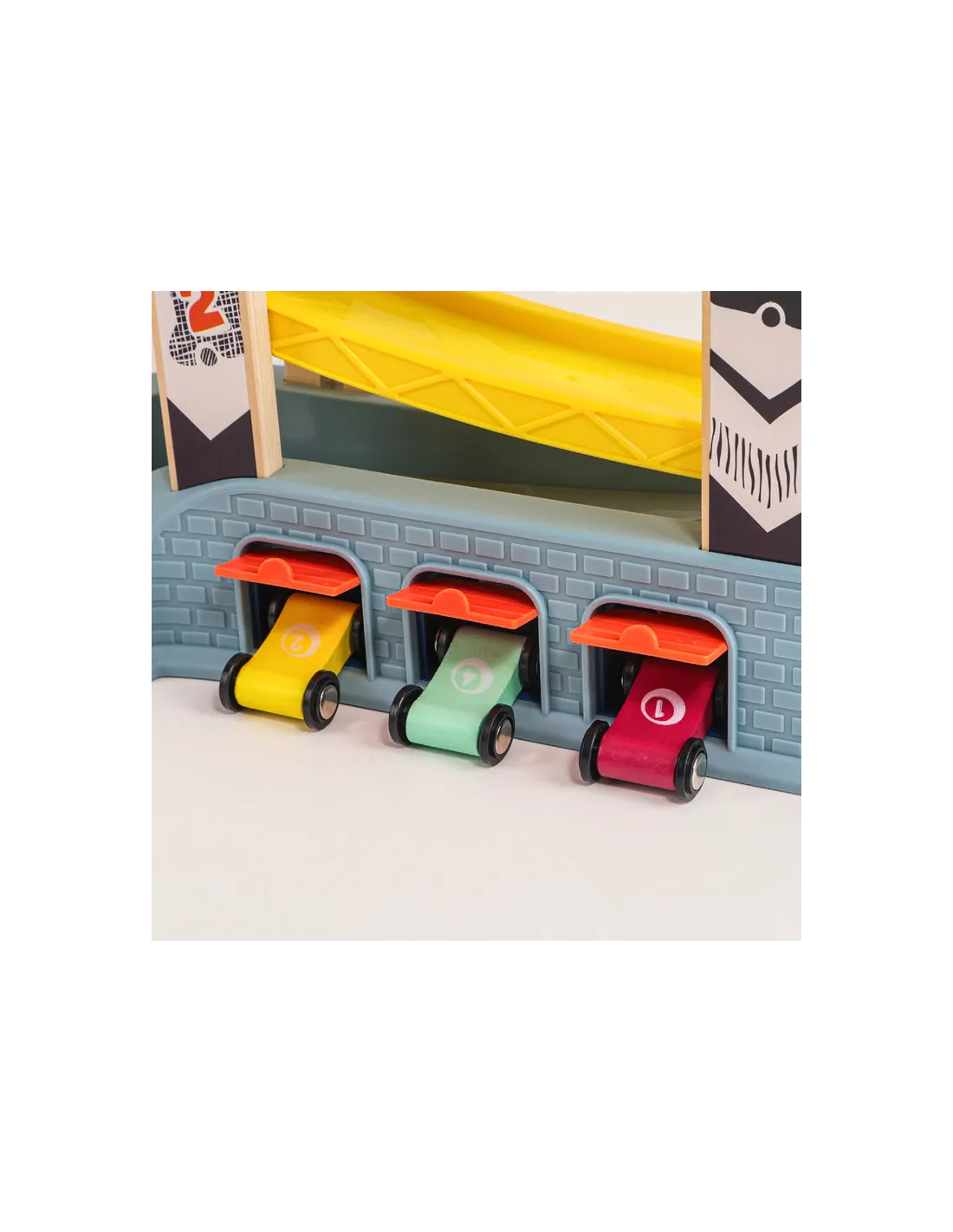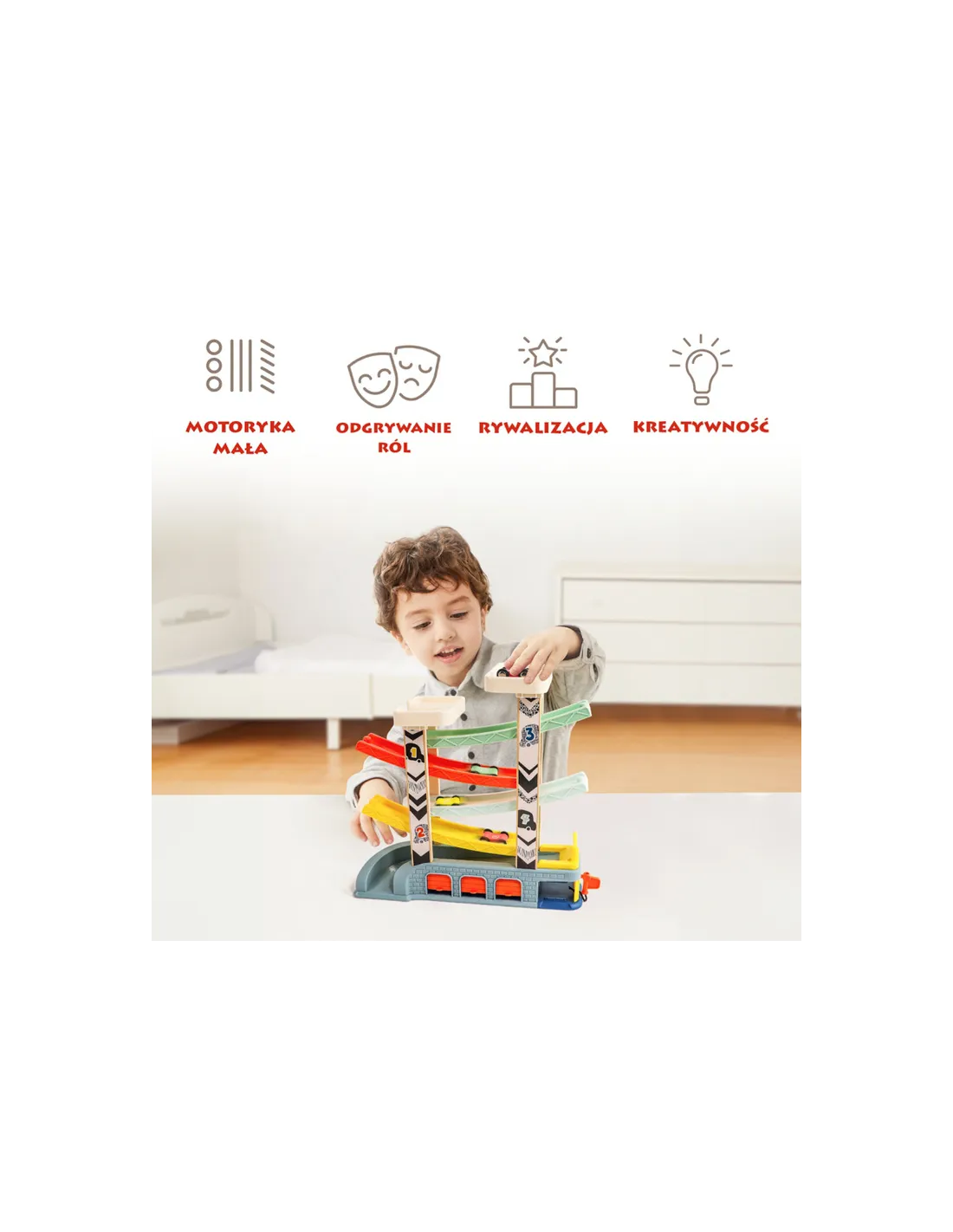 Podczas przesuwania pojazdów, ustawiania ich na rampach oraz obserwowania zjazdów dziecko ćwiczy koordynację ręka–oko oraz motorykę małą. Zabawa wspiera rozwój precyzji ruchów, koncentracji i logicznego myślenia już od najmłodszych lat.