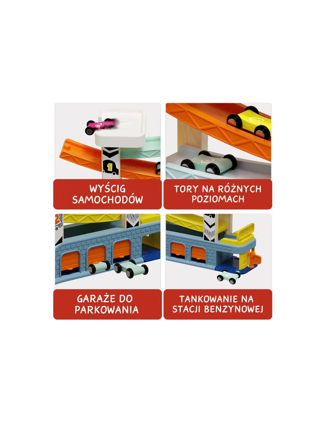 Zestaw umożliwia zabawę zarówno w wyścigi, jak i w spokojniejsze formy aktywności, takie jak parkowanie samochodów czy organizowanie miejsc postojowych.