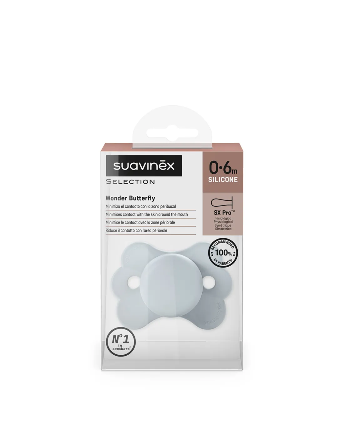 Smoczek fizjologiczny Suavinex SX PRO WONDERLAND 0-6m Motylek Niebieski to innowacyjny produkt stworzony z myślą o zdrowym rozwoju jamy ustnej niemowląt. Został zaprojektowany we współpracy z pediatrami i stomatologami dziecięcymi oraz zatwierdzony przez Hiszpańskie Towarzystwo Stomatologów Dziecięcych, co potwierdza jego bezpieczeństwo i wysoką jakość.