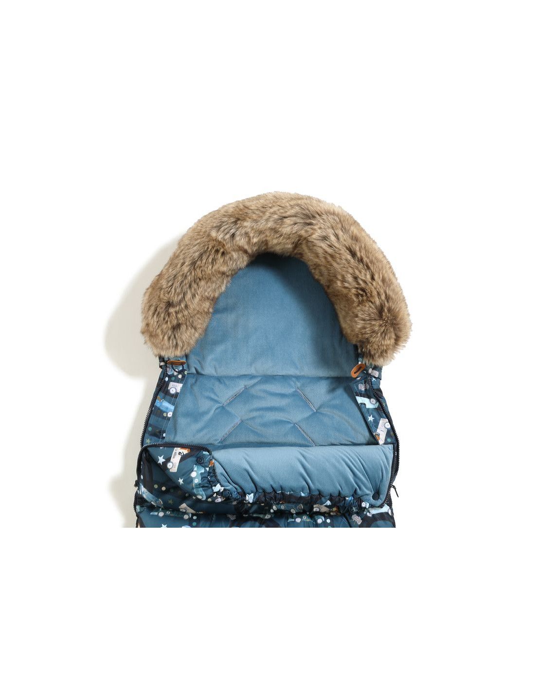 - *Dodatkowa zakładka z materiału z tyłu kaptura, po założeniu na oparcie wózka, uniemożliwia zsuwanie się śpiworka podczas używania
