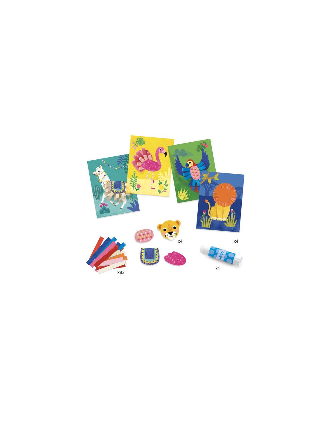 Kreatywny zestaw dla dzieci, w którym można stworzyć 4 duże obrazy ze zwierzętami. Składając i przyklejając kolorowe paski papieru, dziecko stworzy piękną lwią grzywę, piękną papugę, upierzenie flamingów oraz wspaniały płaszcz dla lamy.
