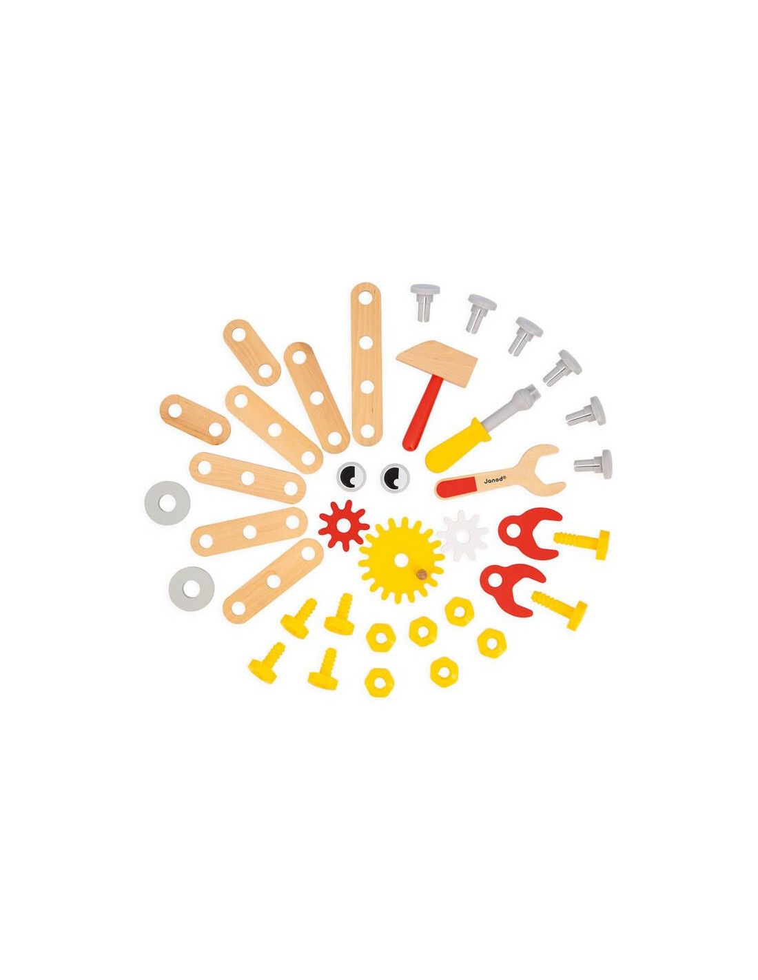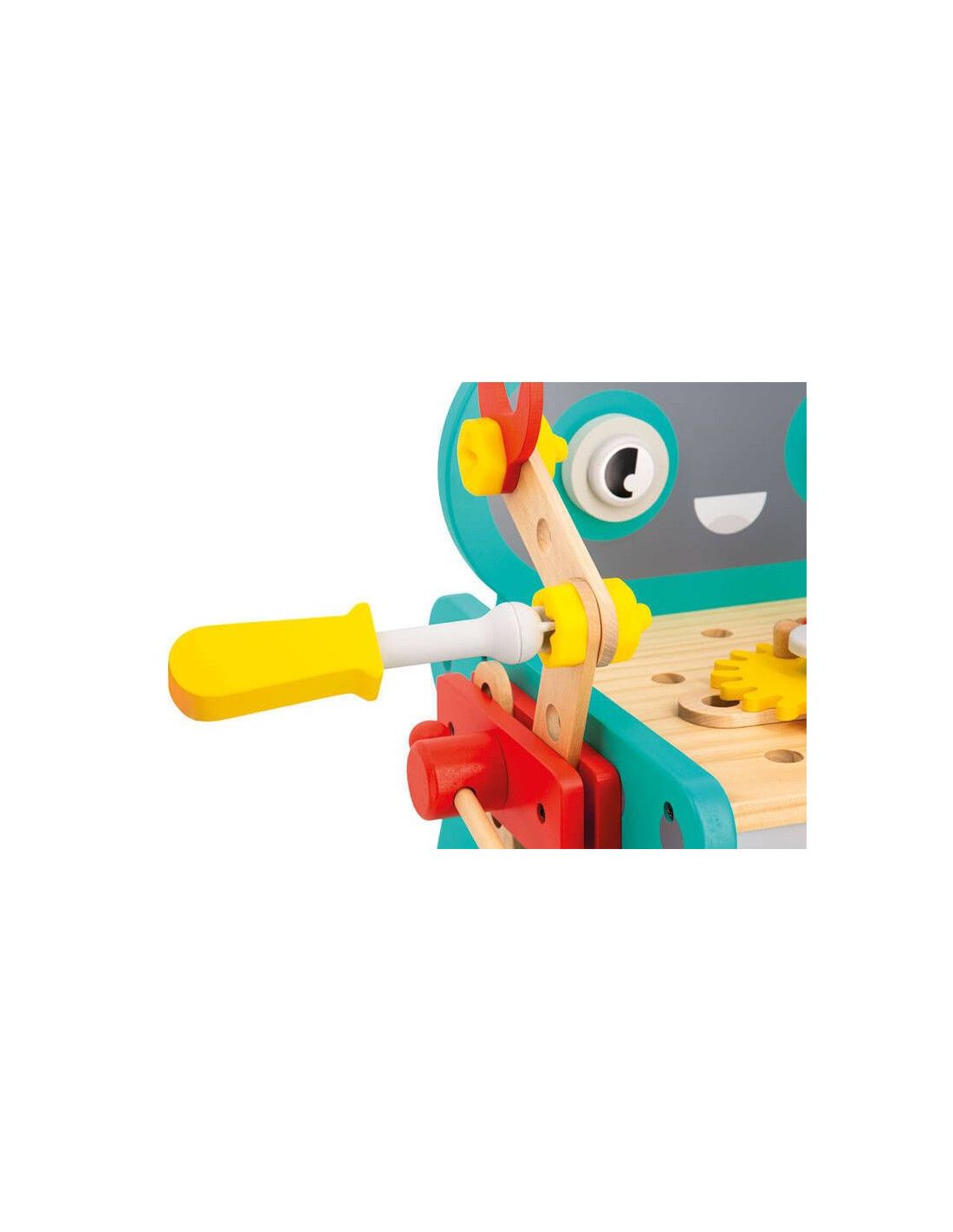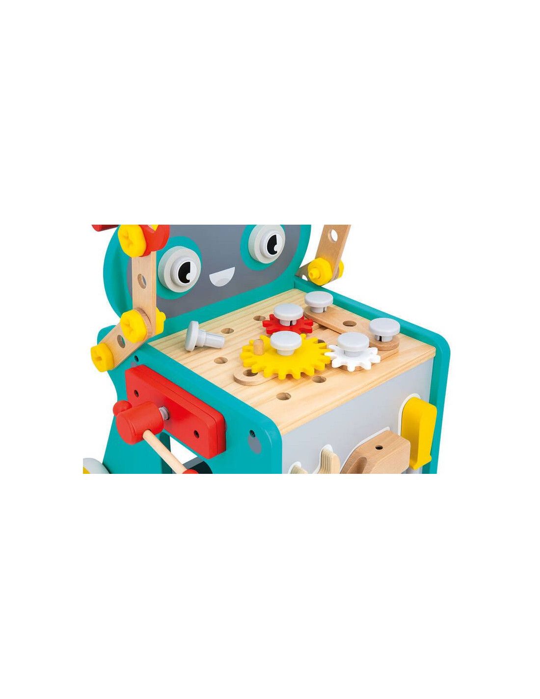 Zestaw zawiera 38 elementów, w tym solidny wózek na 4 kółkach, które nie rysują podłogi, z uchwytem do prowadzenia. Wózek ozdobiony jest oczami i uśmiechem robota, co nadaje mu wyjątkowy charakter. Do zestawu dołączony jest komplet narzędzi: młotek, klucz, śrubokręt oraz śrubki, nakrętki, podkładki i koła zębate, które można magnetycznie przyczepić do ścianki wózka. Wózek wyposażony jest także w blat roboczy, boczne imadło oraz dolną półkę na dodatkowe akcesoria, dzięki czemu może się nim bawić jednocześnie więcej niż jedno dziecko.