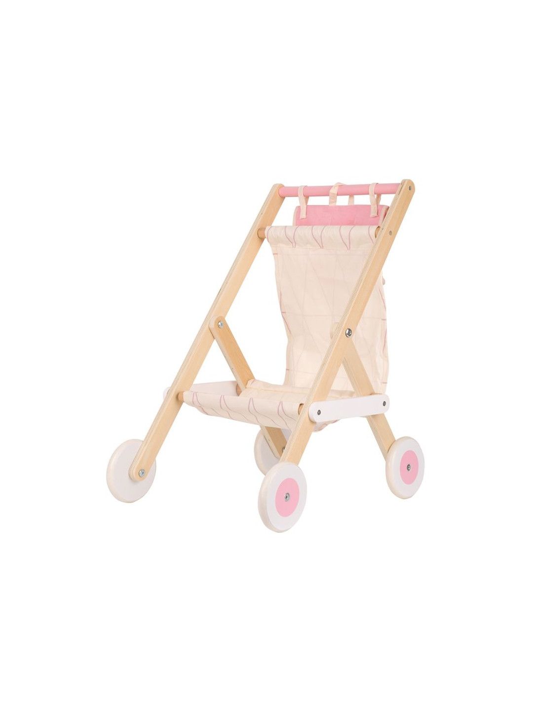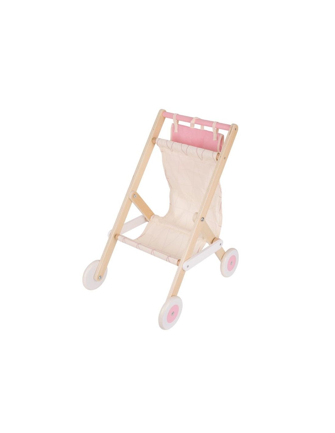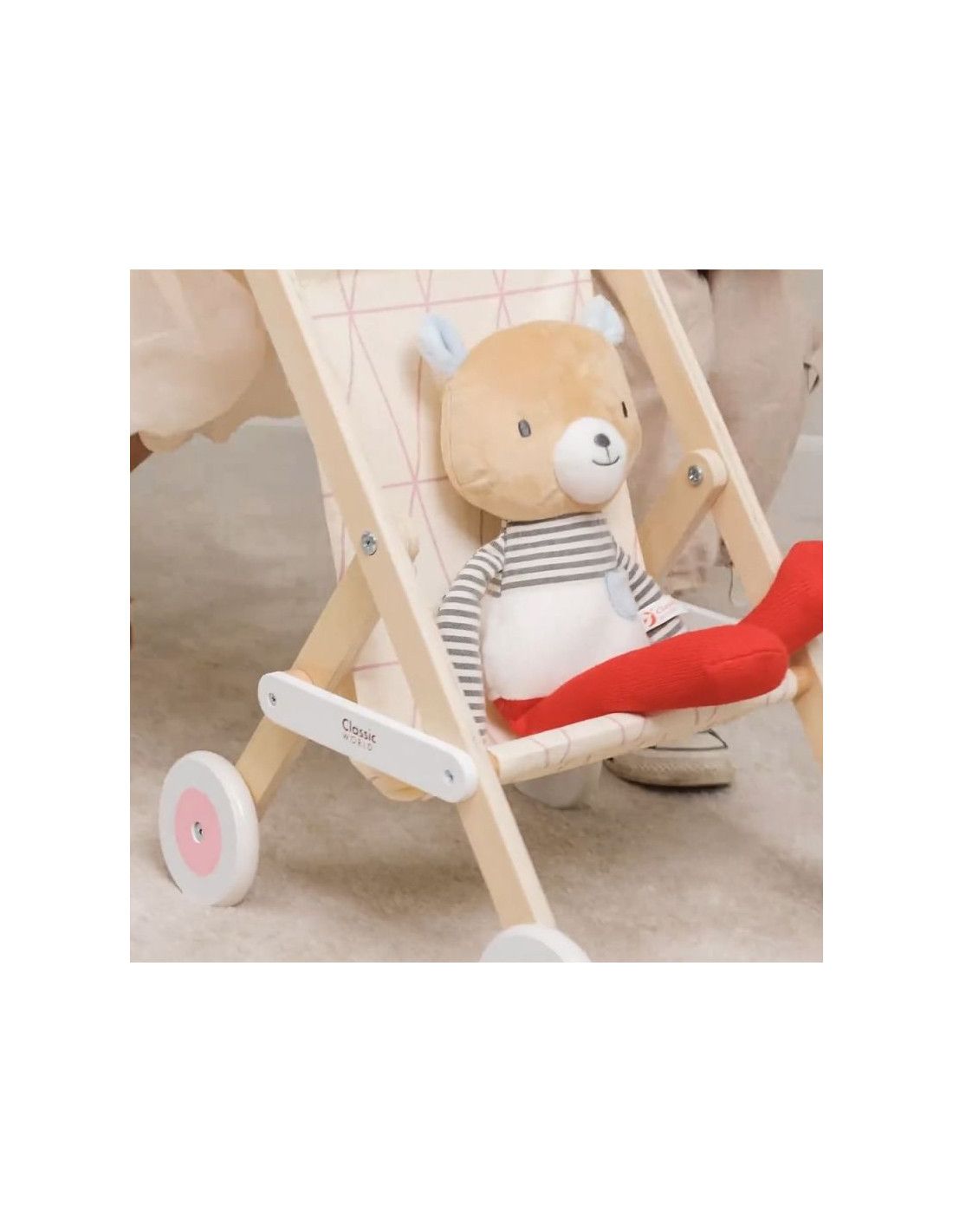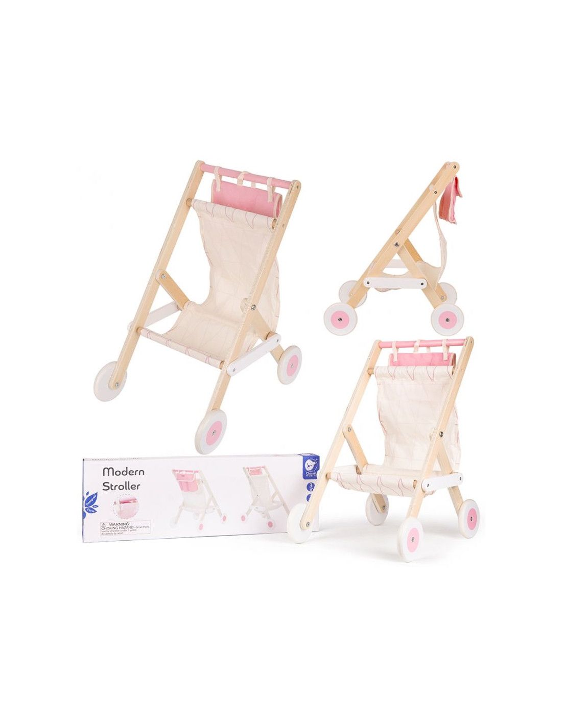 Wózek spacerówka marki CLASSIC WORLD wykonano z naturalnego, jasnego drewna, którego rysunek pozostaje widoczny i wyczuwalny pod palcami. Elementy ramy są delikatnie zaokrąglone, co zwiększa bezpieczeństwo i ogranicza ryzyko otarć podczas zabawy. Uchwyty oraz środek kółek pokryto matową, różową powłoką, dodającą całości lekkości i przyjaznego charakteru, bez naruszania spójności stylistycznej.
