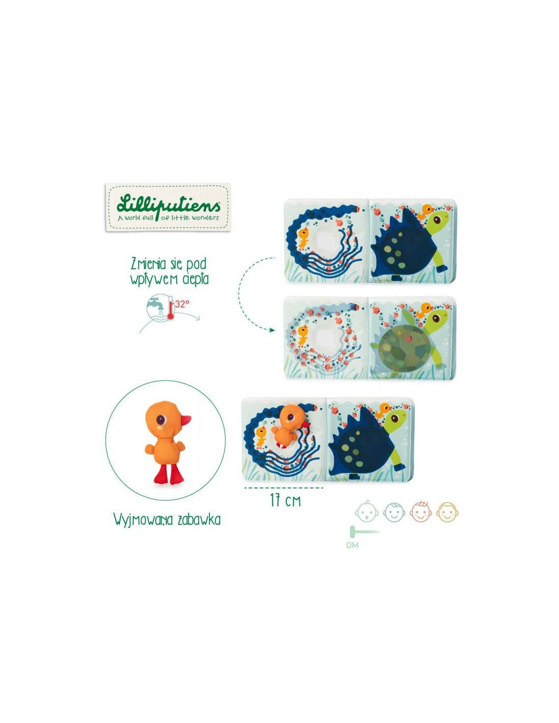 Wykonana z przyjemnego w dotyku, bezpiecznego dla maluszków materiału, książeczka oferuje wyjątkową funkcję – po zanurzeniu w wodzie o temperaturze minimum 32°C, niektóre postacie zmieniają się, odkrywając swoje nowe oblicza. To prawdziwa magia w trakcie kąpieli!