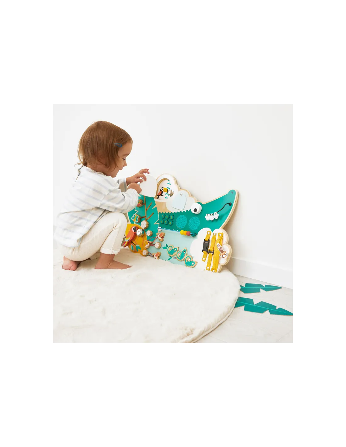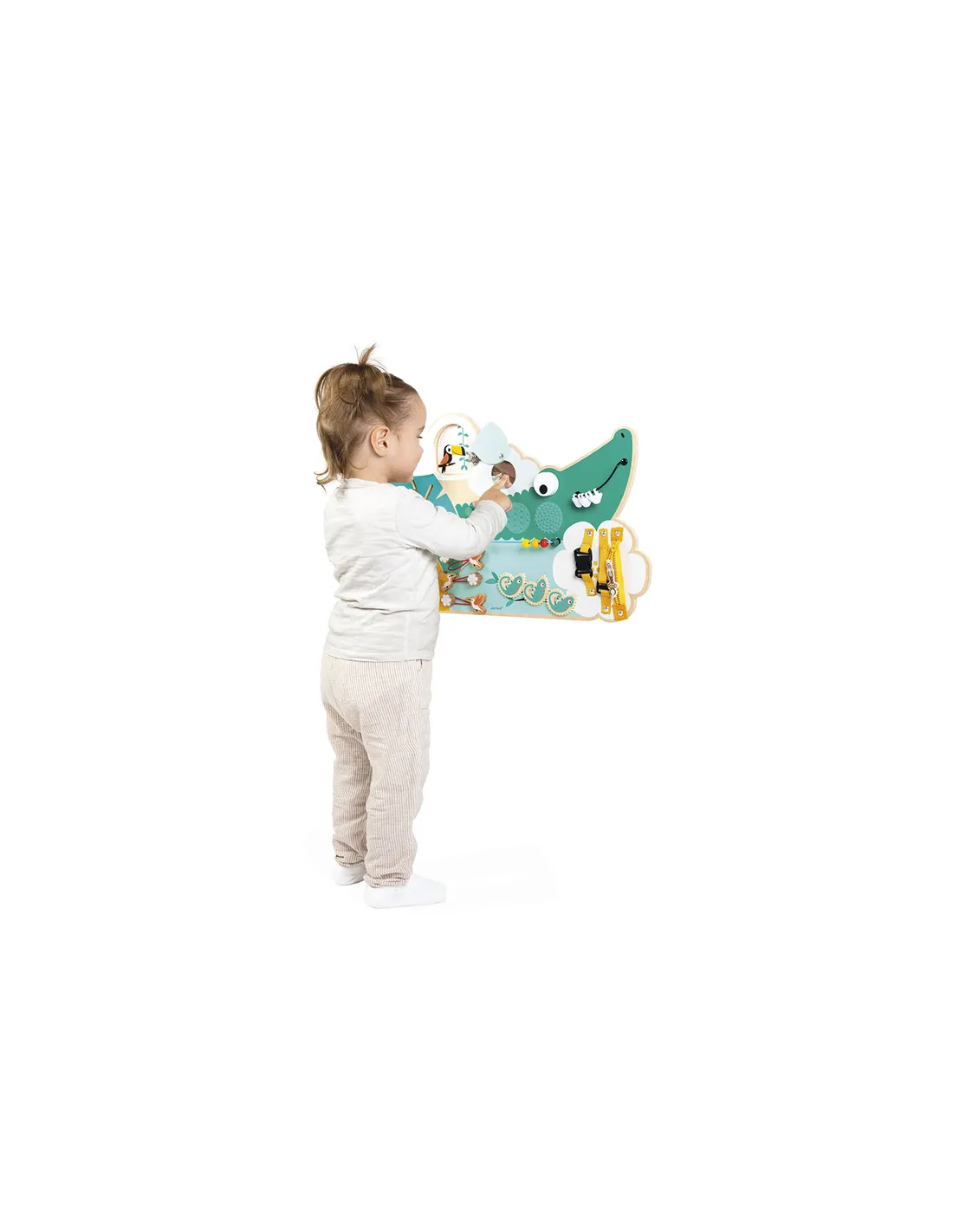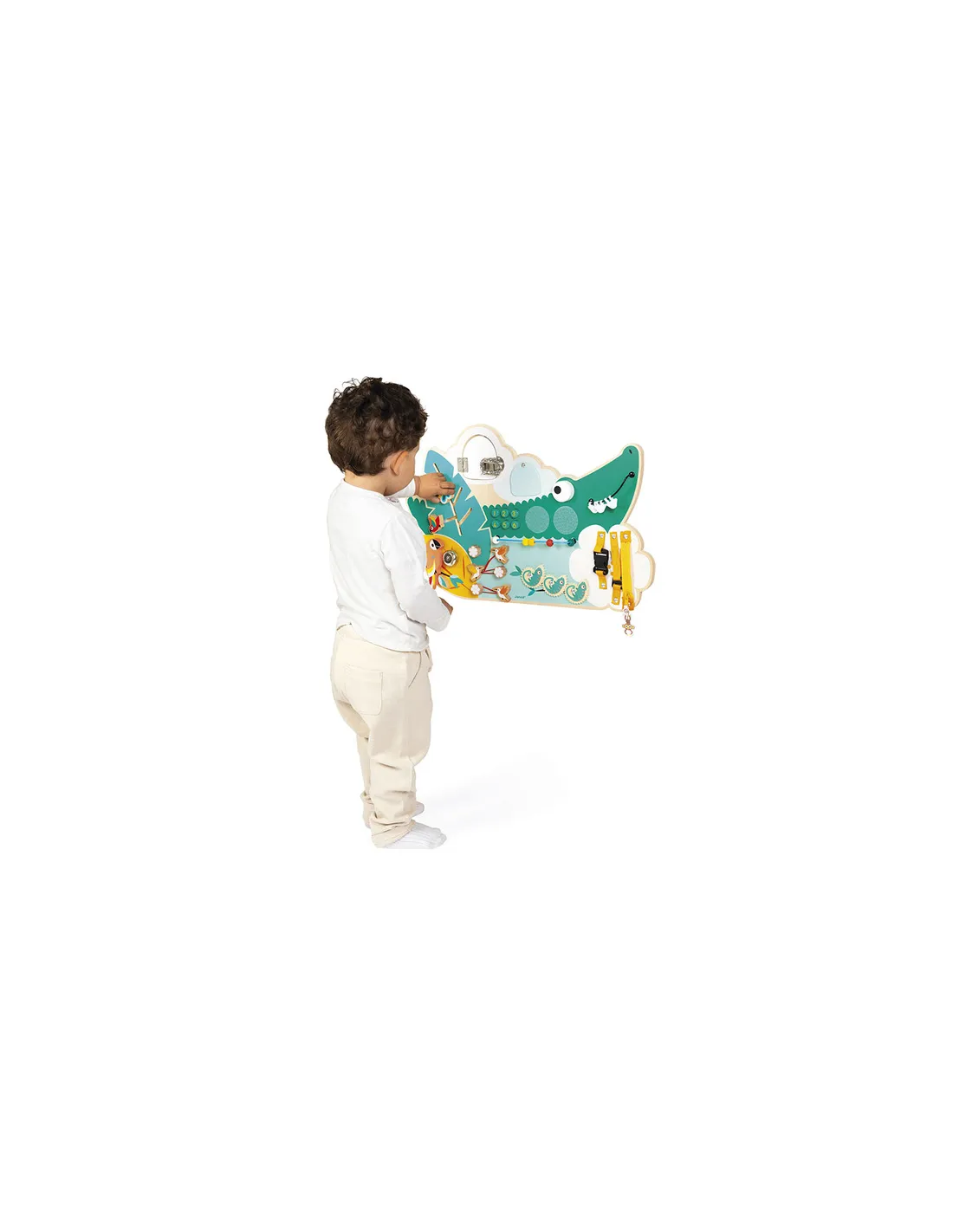 Tablica montowana do ściany ma kształt kolorowego krokodyla i oferuje aż 14 różnorodnych aktywności, które wspomagają rozwój małej motoryki, koordynacji ręka-oko oraz logicznego myślenia.