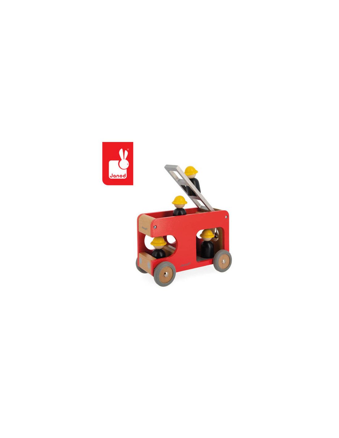 Drewniana straż pożarna z serii Bolid francuskiej marki Janod to świetna zabawka dla małych fanów motoryzacji i nie tylko. Zestaw składa się z piętrowego wozu strażackiego z demontowaną drabiną i 4 strażaków (czarne figurki w żółtych kaskach). Pojazd ma kolor czerwony, naturalnego drewna i szarości. Koła mają solidne metalowe osie i wykończone są gumą, aby nie rysowały powierzchni w domu. Kształty są zaokrąglone i bezpieczne dla dzieci. Elementami zestawu można się również bawić oddzielnie. Zabawka stanowi część większej kolekcji Bolid.
