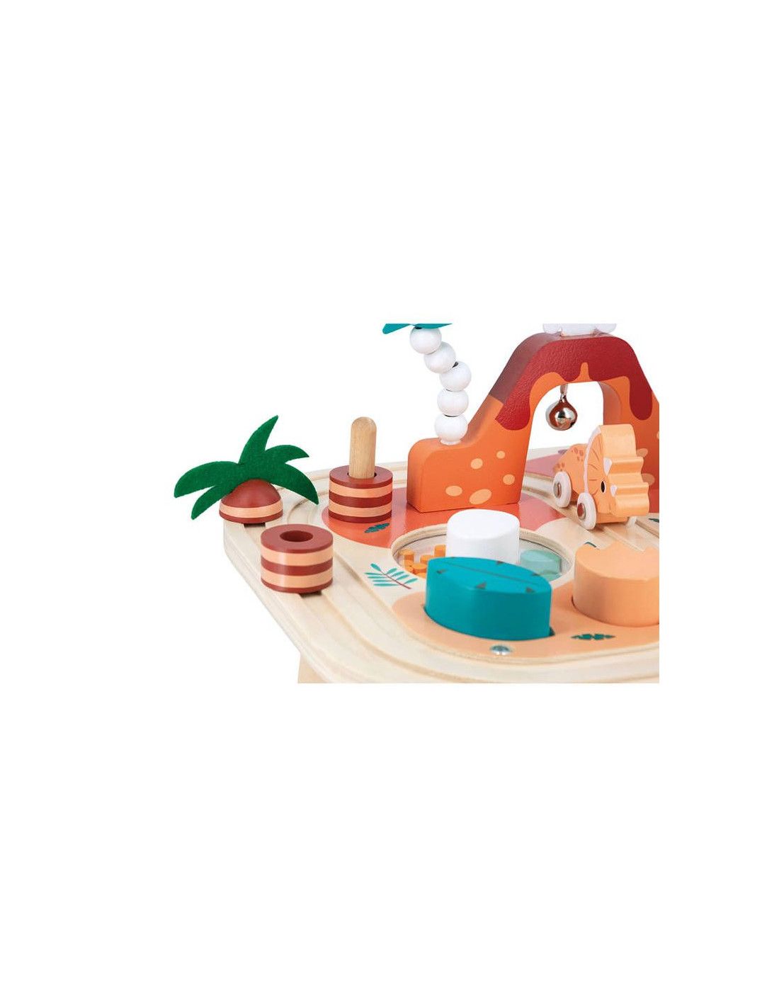 Stolik ma solidną konstrukcję, z zaokrąglonymi brzegami i szerokimi nóżkami, co zapewnia maksymalne bezpieczeństwo podczas zabawy. Jego prostokątny kształt zdobią żywe kolory oraz detale przenoszące dzieci w świat dinozaurów. Na uwagę zasługuje tor dla drewnianego wagonika w kształcie triceratopsa, który przemyka pod wulkanem, poruszając dzwoneczek o przyjemnym dźwięku. Stolik oferuje również pętlę z pterodaktylem i koralikami, palmę-piramidkę do układania, kółka zębate z wykluwającym się dinozaurem oraz sorter nietypowych kształtów.