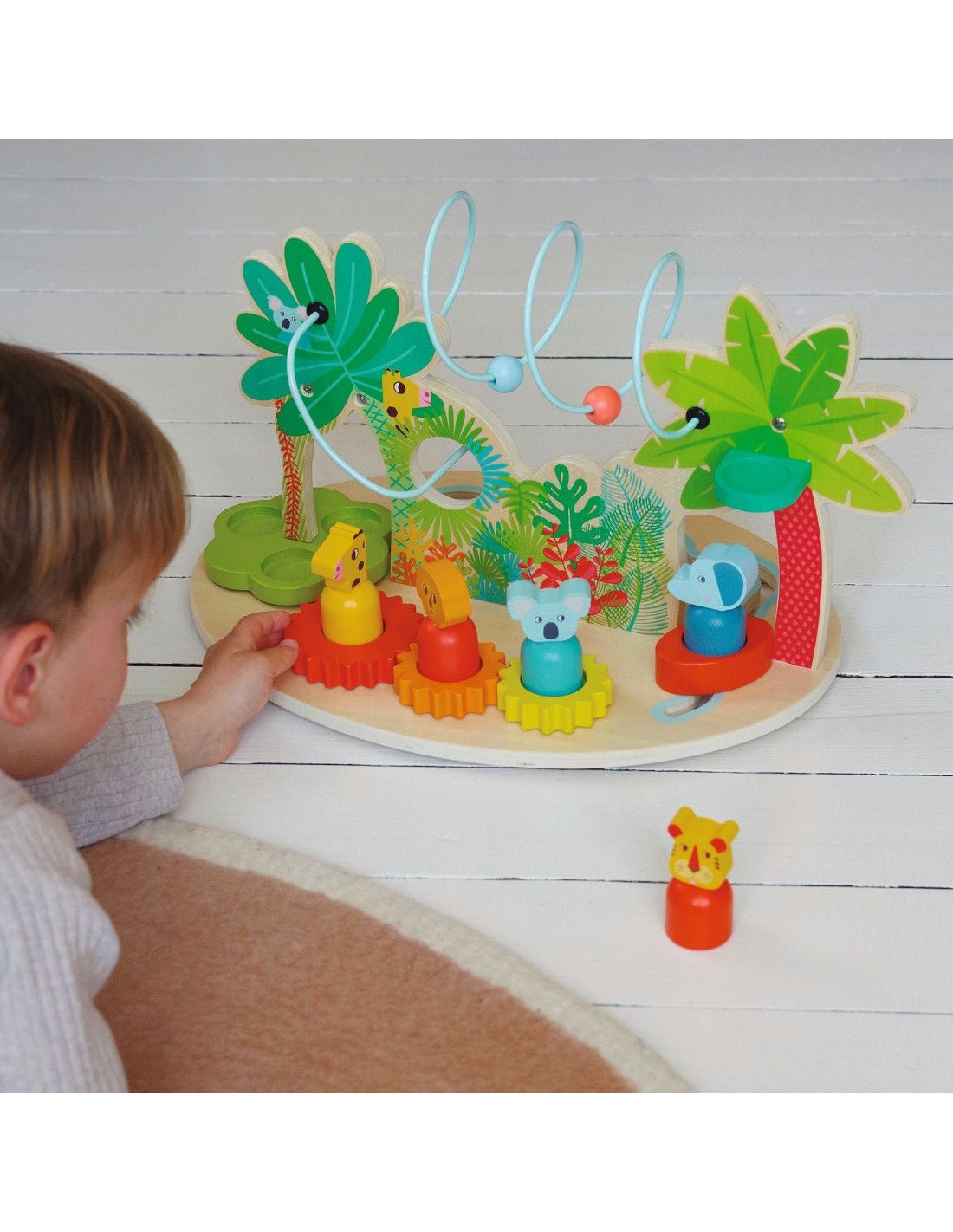 - Kreatywne aktywności: Maluch może m.in. przesuwać łódkę po rzece, manipulować koralikami na labiryncie, sadzać zwierzątka na drzewach, czy kręcić kołem z kokosami wydającymi dźwięki.