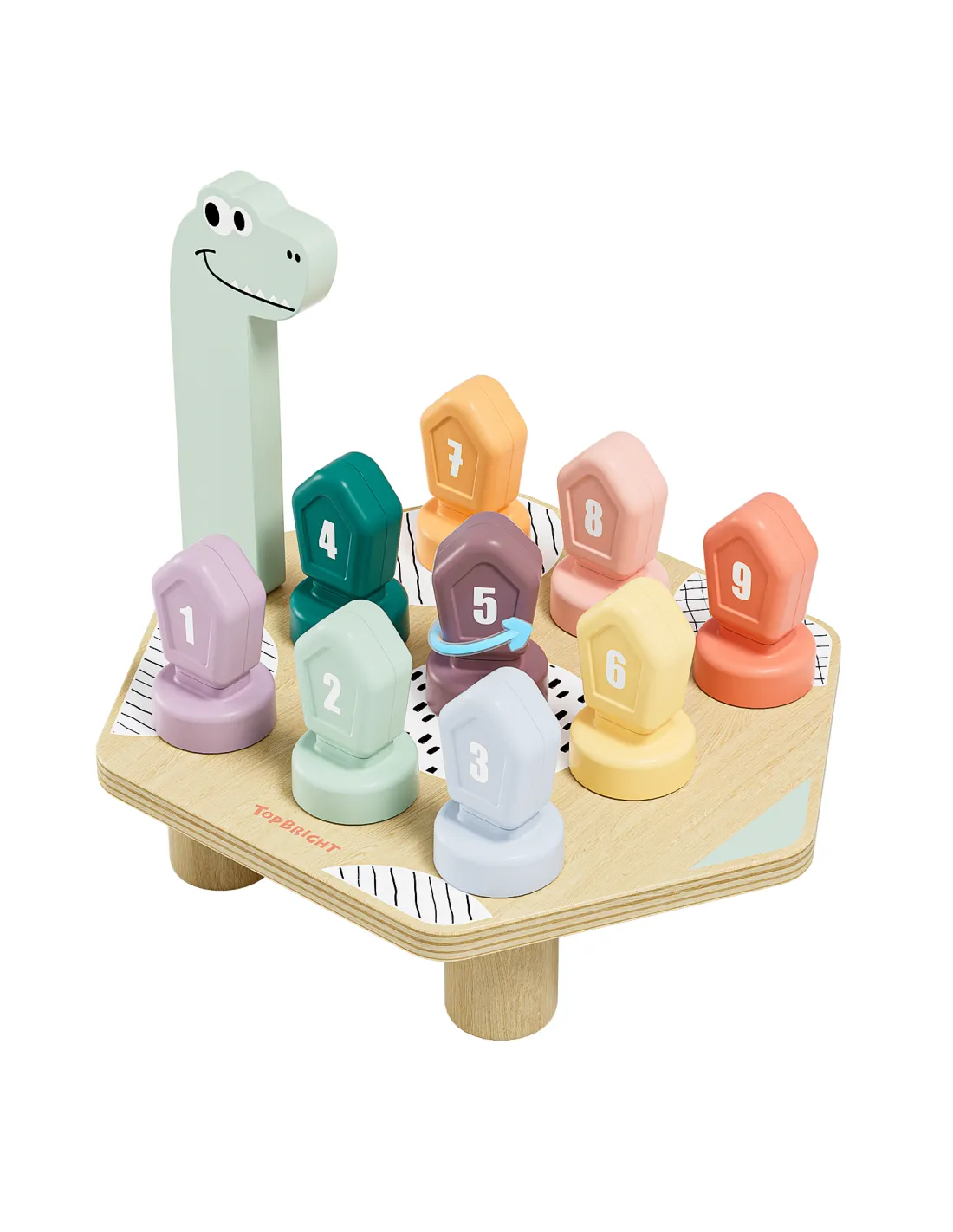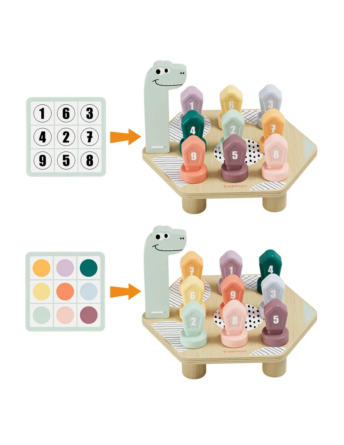 Gra do nauki kolorów i liczb Dino Topbright to drewniana zabawka edukacyjna dla dzieci od 3 lat, która łączy naukę z aktywną zabawą manualną. Kolorowe elementy, cyfry od 1 do 9 oraz motyw sympatycznego dinozaura zachęcają dziecko do samodzielnego odkrywania liczb i barw w naturalny, angażujący sposób.
