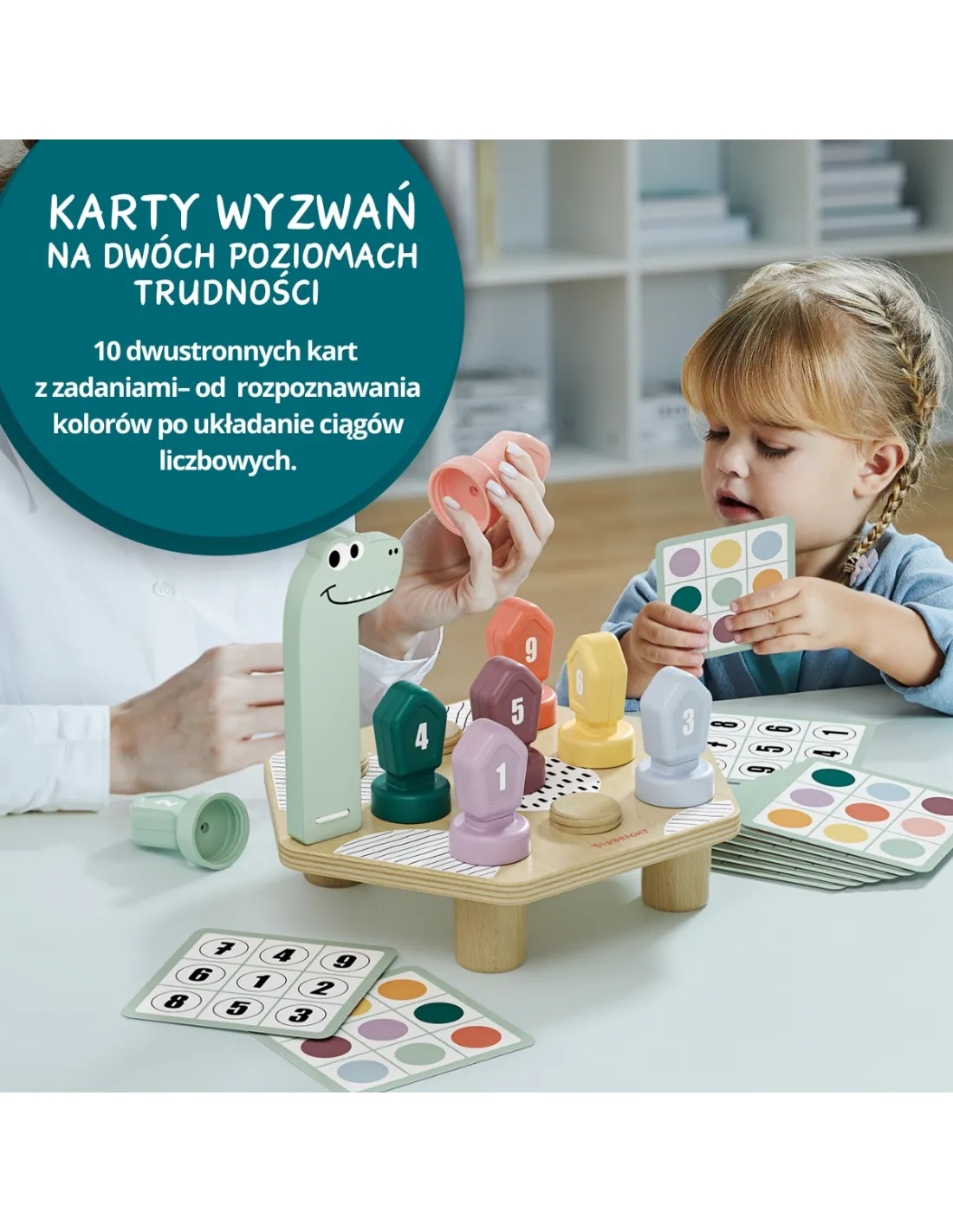 Zestaw zawiera 10 dwustronnych kart z wyzwaniami, które oferują dwa poziomy trudności. Prostsze zadania skupiają się na rozpoznawaniu kolorów, natomiast bardziej zaawansowane wprowadzają układanie ciągów liczbowych. Dzięki temu zabawka rośnie razem z dzieckiem.